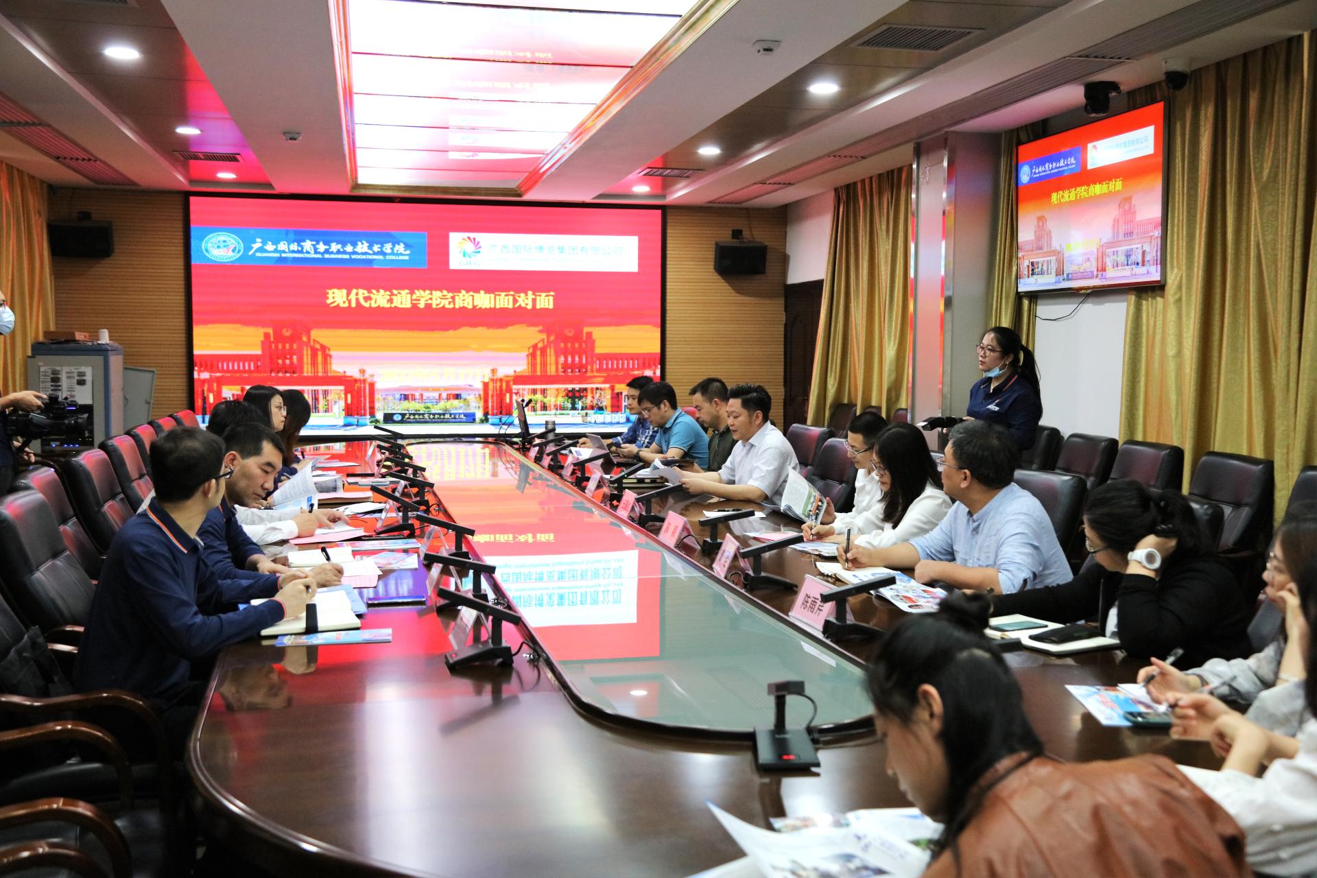 为促进产教融合,校企合作,弘扬现代商务文化,活跃学校职教氛围,打造校企交流平台,现代流通学院于5月17日开展“商咖面对面”系列活动。学校校长王国红、副校长刘杰英出席活动,广西国际博览集团副总经理邓诗军、广西会展时空科技信息有限公司总经理区晓文、总经理助理贺建东、运营管理部副部长李坚等企业人员入校参加活动。