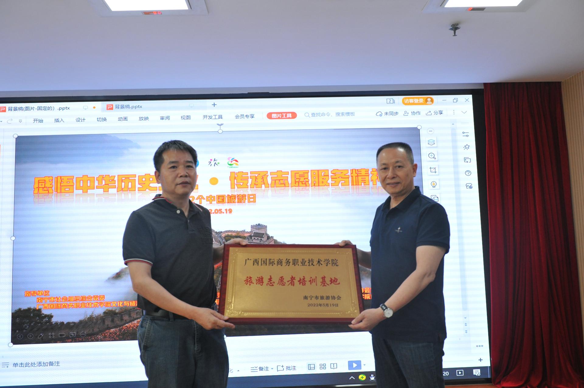 曾国宁向文旅学院授“南宁市旅游协会旅游志愿者培养基地”牌匾