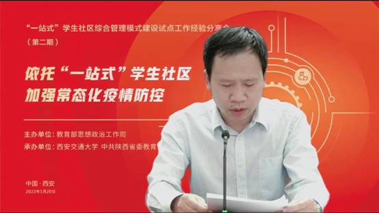 此次经验分享会是教育部思想政治工作司就新形势下高质量推进“一站式”学生社区建设采取的重要举措。我校前期做了大量探索与实践,并于2022年5月入选“一站式”学生社区综合管理模式建设自主试点单位。