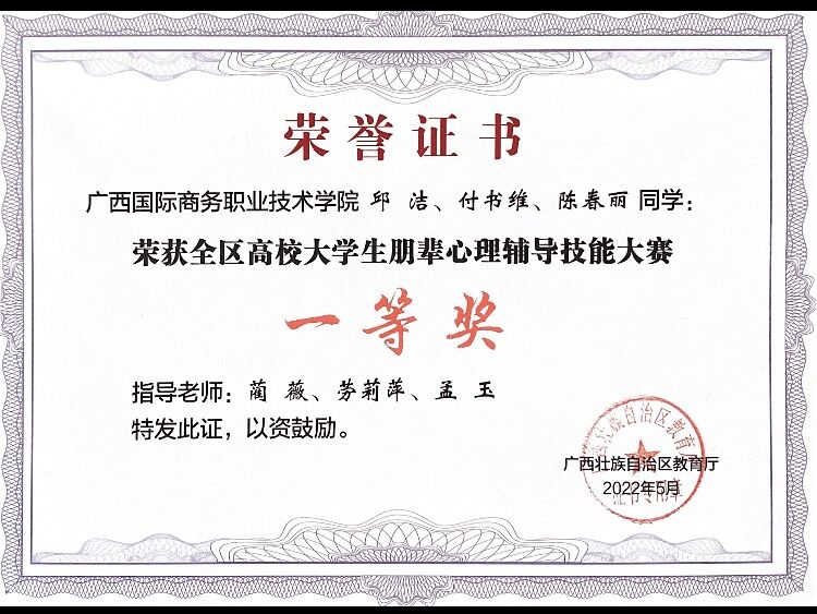 5月28至29日,自治区教育厅主办、广西财经学院承办的全区高校朋辈心理辅导技能大赛在南宁举办。共有来自全区高校93支参赛队伍,近300名学生参加了本次大赛,由国际贸易学院的邱洁、会计学院的付书维、国际贸易学院的陈春丽三名学生组成的广西国际商务职业技术学院队,荣获大赛一等奖。