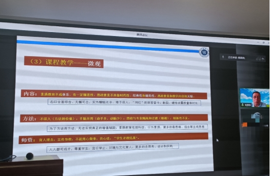 杨国良采取线上培训的方式,为参会教师阐述了深化课程思政育人的几个关键点,从课程思政的设计、融入及评价三大方面详细讲解了如何系统推进课程思政建设与实施,指导大家从宏观的政策梳理、中观的岗位升级到微观的课堂教学进行课程思政的体系构建和结构化设计,并利用丰富详实的优秀案例分享了如何课程思政元素有机融入课堂教学的成果和经验。他强调,把思想政治教育融入专业教学,是一项长期的战略任务,不能过于关注短期数据而忽视了育人的根本任务。