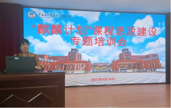 为深入贯彻《高等学校课程思政建设指导纲要》《全面推进广西高等学校课程思政建设的实施意见》等文件精神,全面推进学校课程思政建设工作,落实立德树人根本任务,提升教师课程思政能力,6月14日,我校在图书馆8楼报告厅组织开展了“麒麟计划”课程思政建设专题培训会,邀请了天津职业大学经管学院院长杨国良教授、广西交通职业技术学院质量管理办公室主任罗小青教授两位专家为学校各专业负责人、学校课程思政示范课程立项申报团队和感兴趣的教师开展培训。