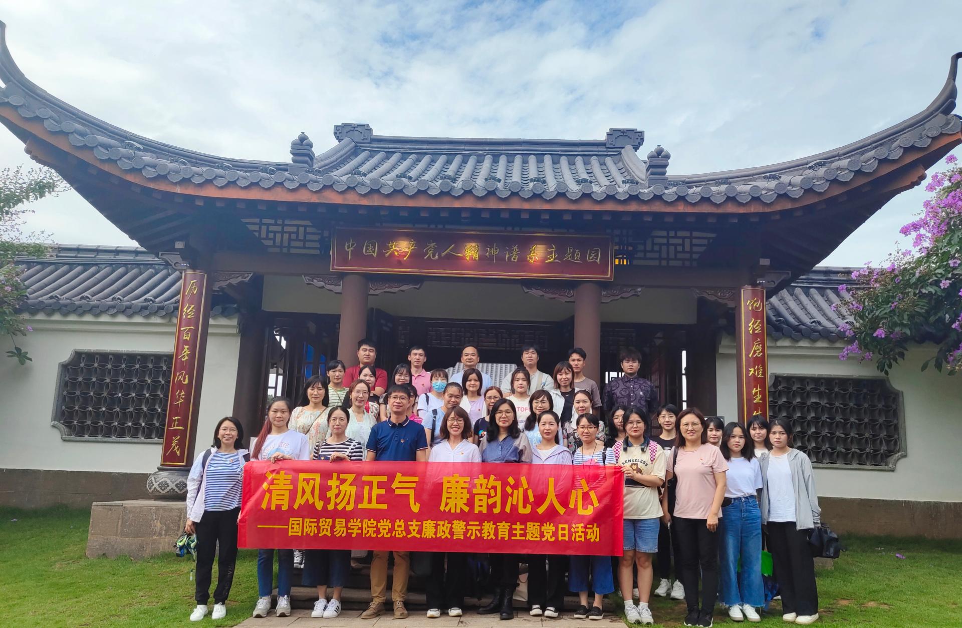 为贯彻落实学校党委“七个一”校园廉洁宣传教育工作有关要求,大力推进清廉学校建设,增强党员教师廉洁从教的思想自觉和行动自觉,6月14日,国际贸易学院党总支组织学院领导班子、全体党员教师、学生发展对象和入党积极分子代表一行40人到南宁市青秀山开展“清风扬正气 廉韵沁人心”主题党日活动,接受廉政警示教育。