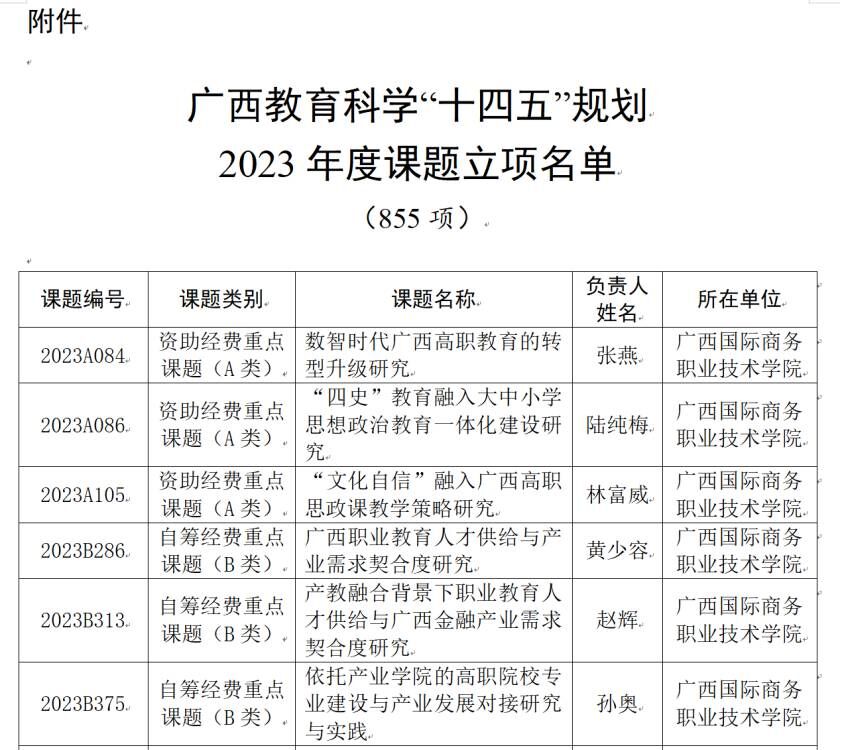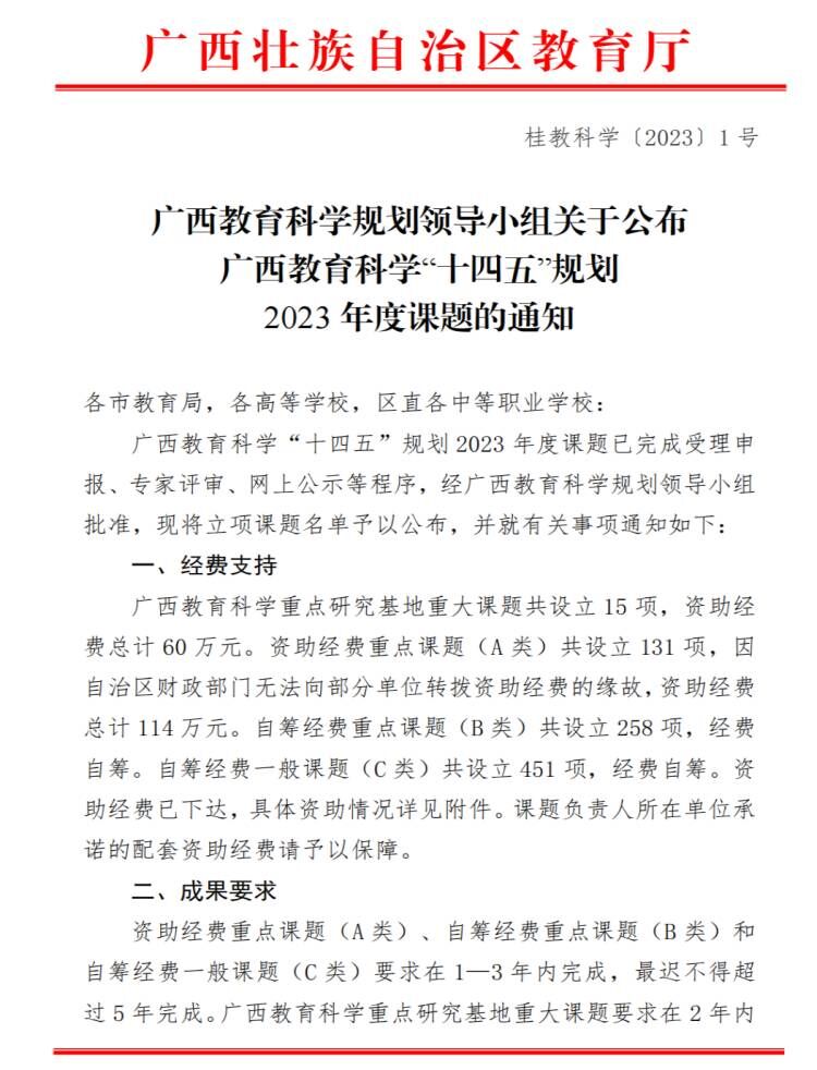 1月28日,广西教育科学规划领导小组公布了广西教育科学“十四五”规划2023年度课题立项的通知。我校6名教师课题获得广西教育科学“十四五”规划2023年度重点课题立项,其中,资助经费重点课题(A类)3项,自筹经费重点课题(B类)3项。这是我校今年首次获取科研项目立项的佳绩,也是迄今为止我校获得广西教育科学规划课题单次重点课题立项数量最多的战绩。