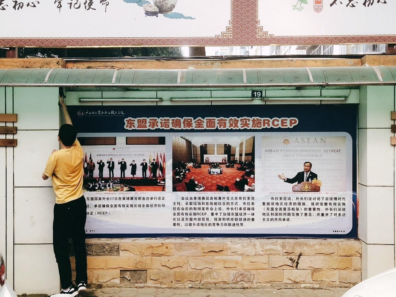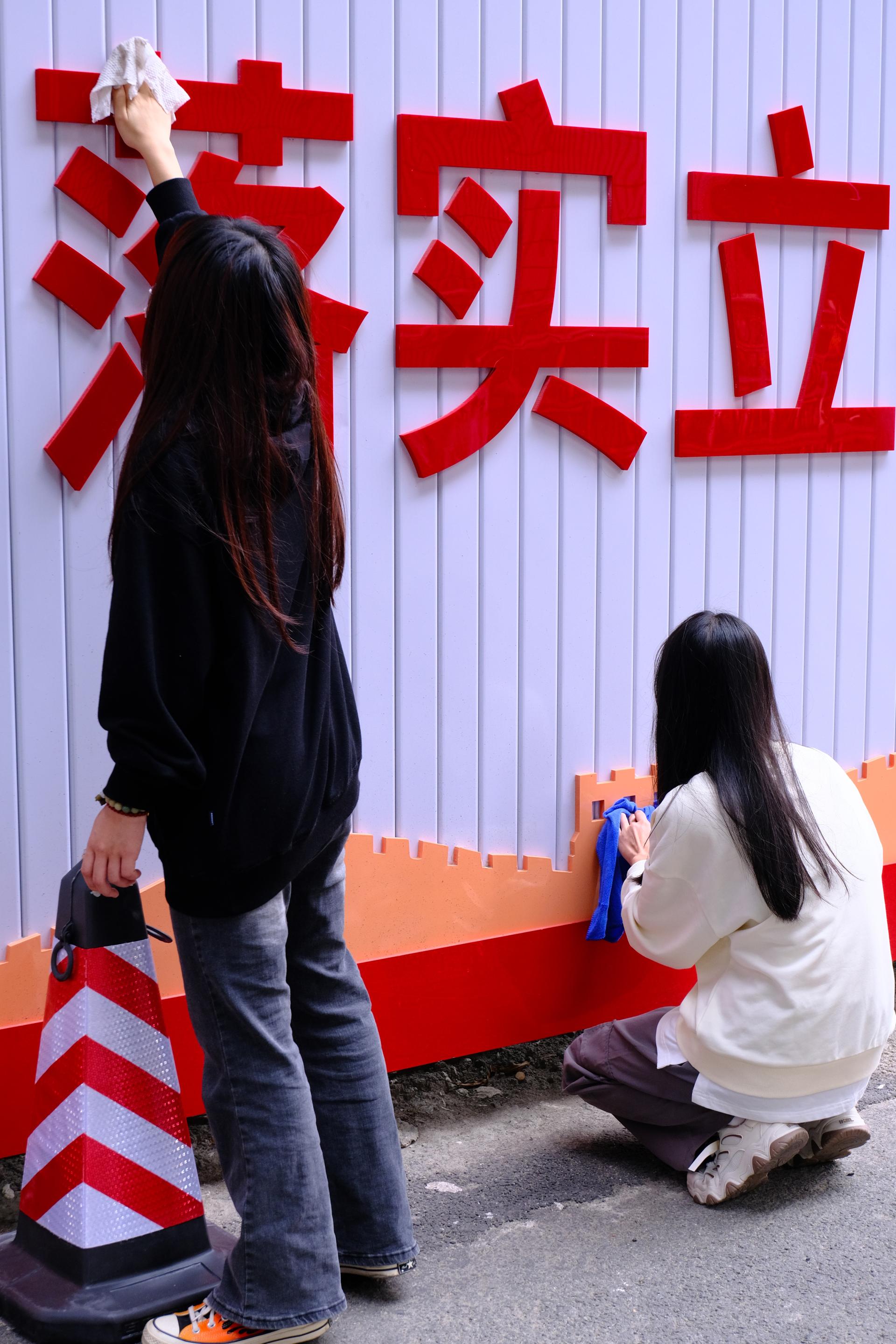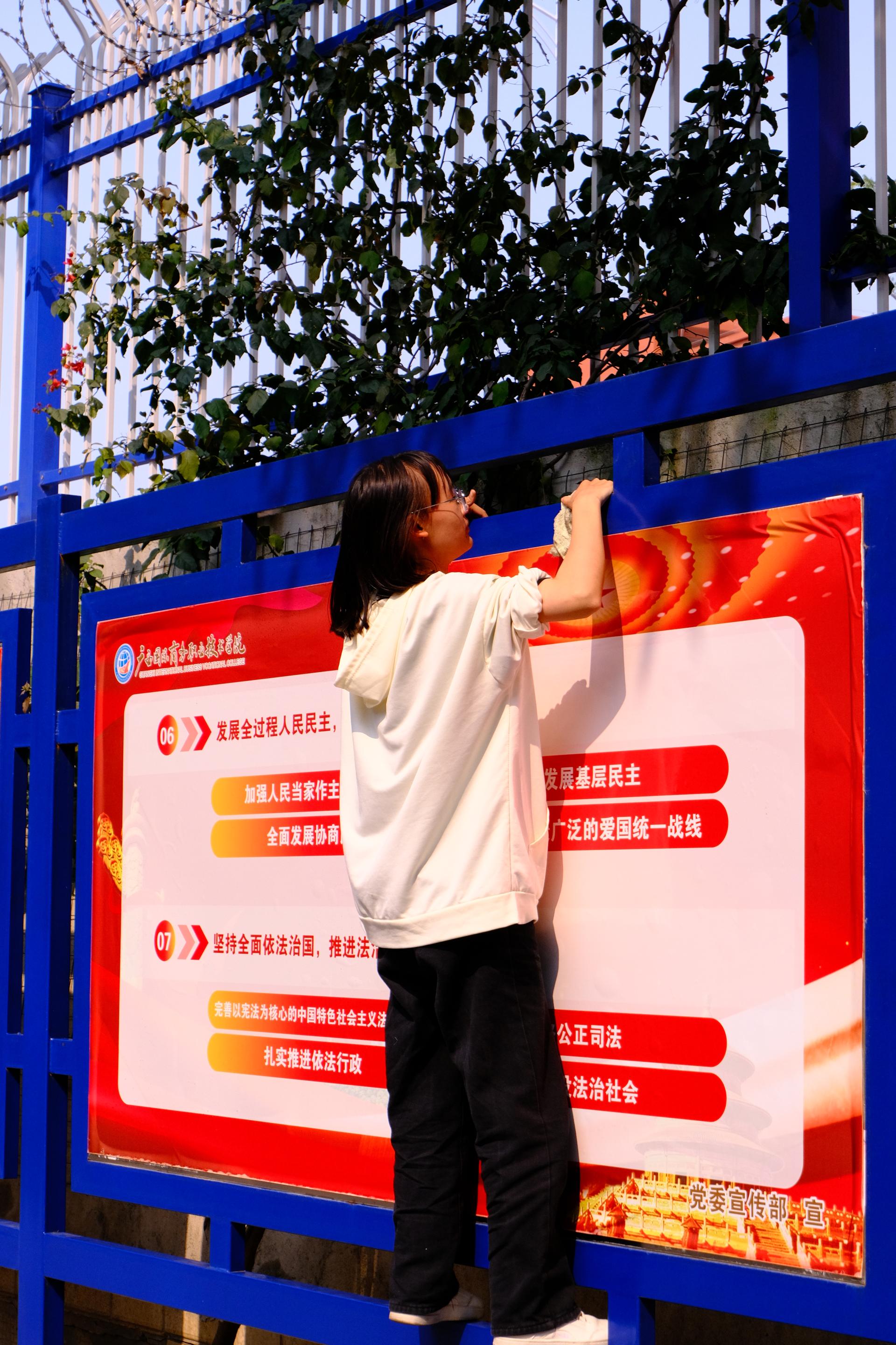 学生志愿者们对校园文化长廊开展清洁服务