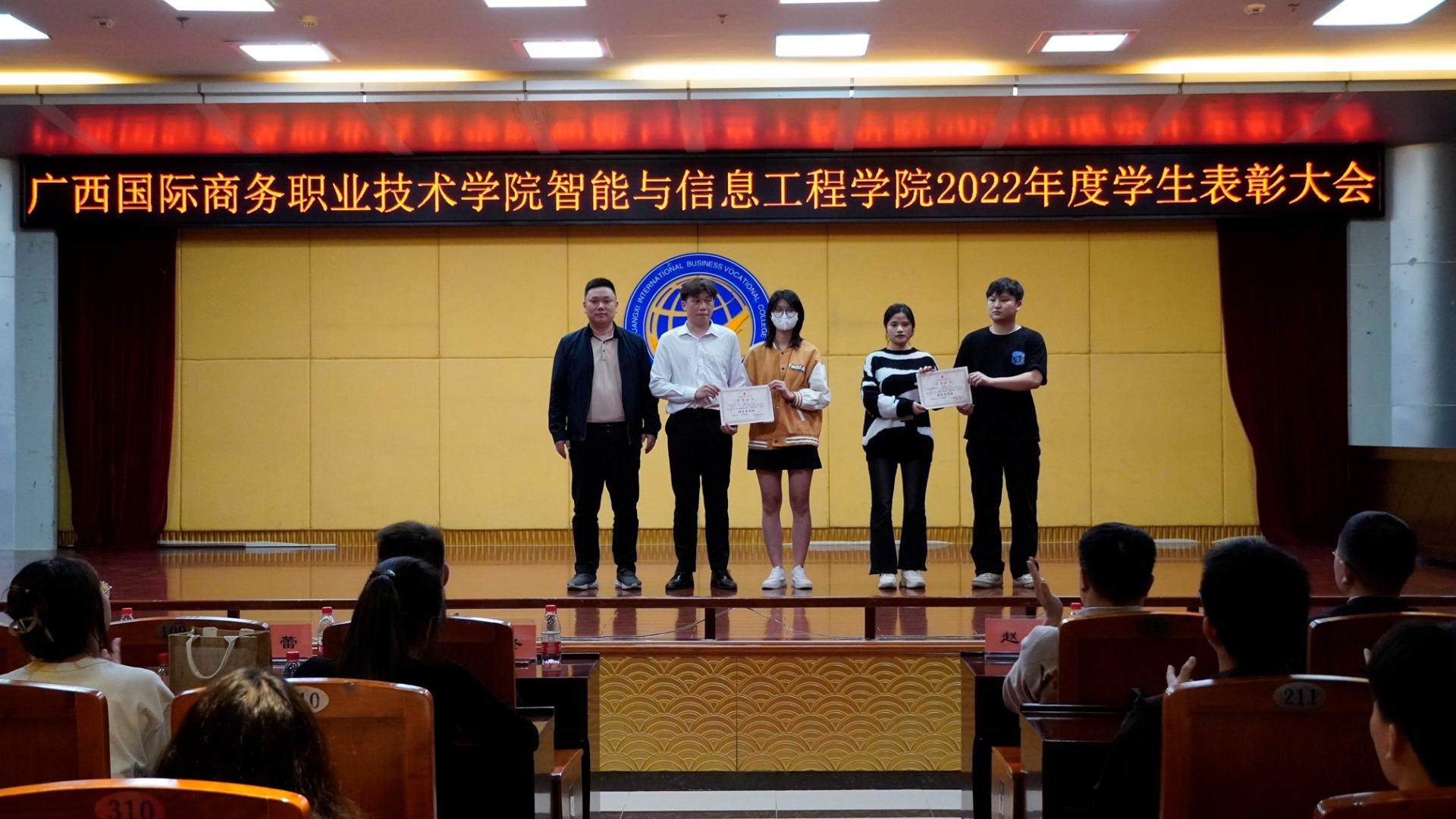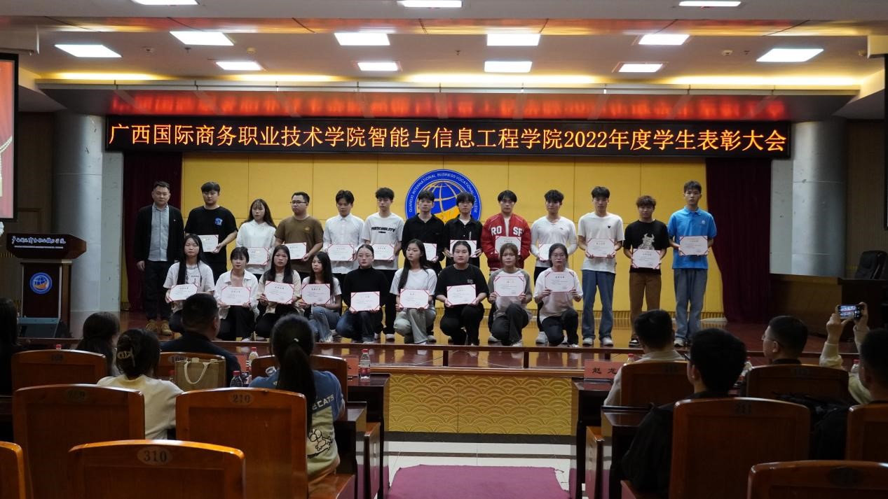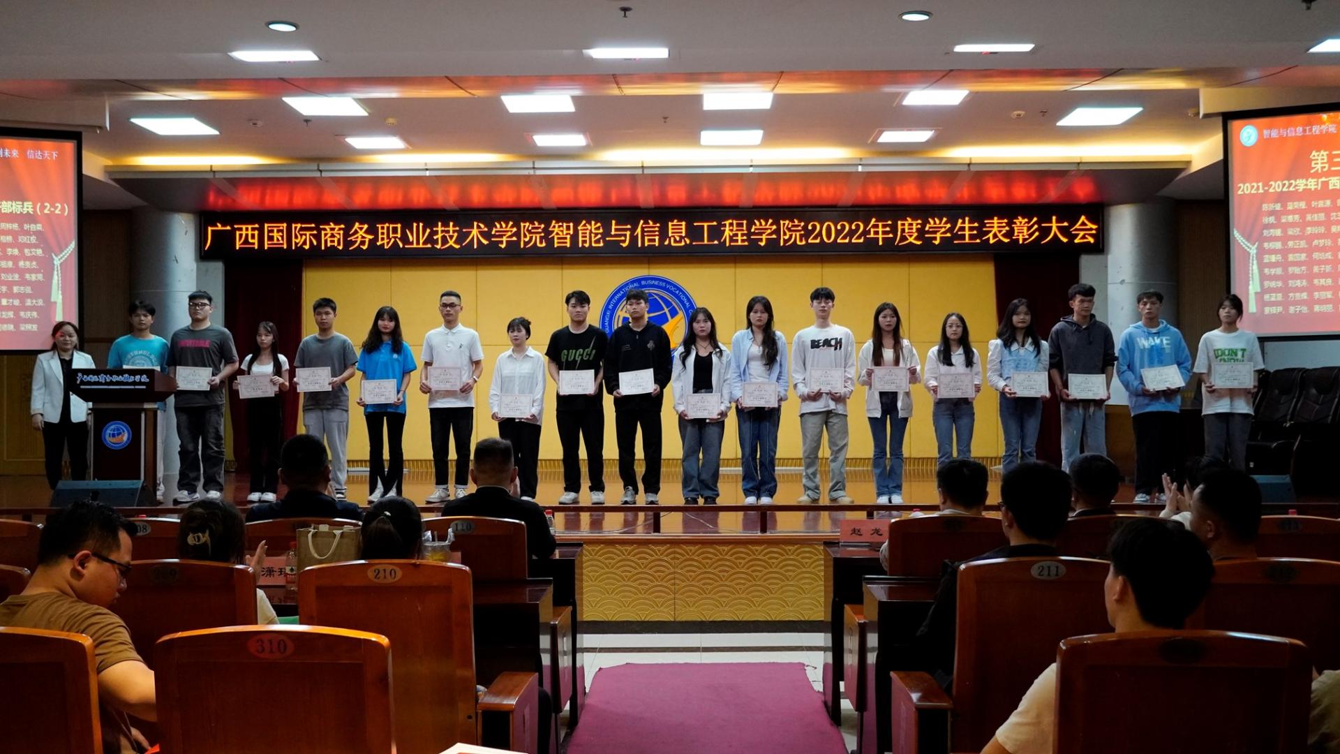 为弘扬奋斗精神,树立良好榜样,营造良好和谐的校园氛围,4月25日晚,我校智能与信息工程学院在大学路校区图书馆11楼学术报告厅召开2022年度学生表彰大会。党总支副书记李冬、学院副院长郑蕾、党总支专职副书记潘慧妮、副院长周菊瑄、深圳市瑞视云智科技有限公司总经理赵龙、教学经理徐小明、学院专兼职辅导员及300余名学生参加了此次大会。