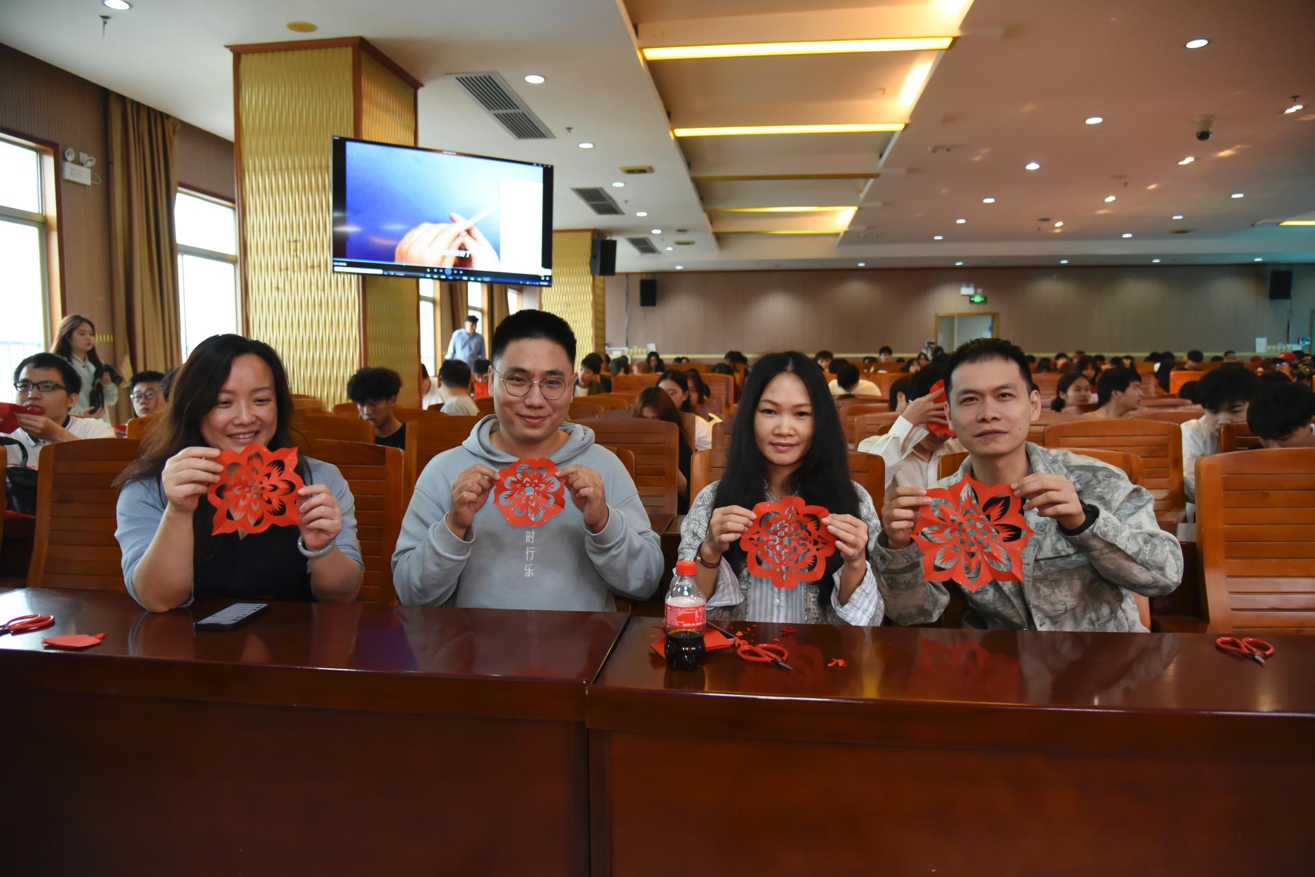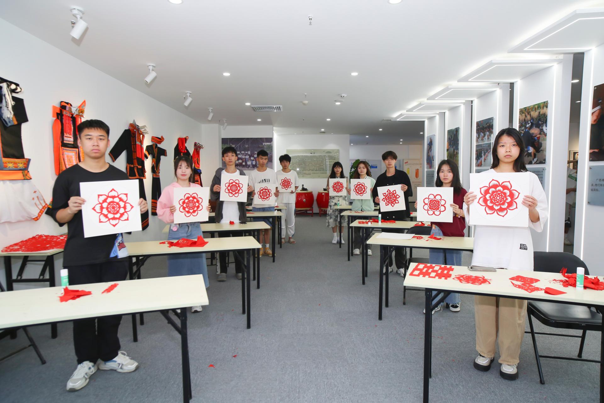 本次教学与实践活动共分为剪纸艺术理论讲解与剪纸教学实践两个部分。首先,钟昀睿老师分享了自己的亲身经历,讲述了如何与剪纸结下的艺术情缘,以及她学习传承剪纸艺术中所取得的成绩。接着钟老师介绍了南宁剪纸艺术的发展、传承和剪纸技法,她还展示了近年来创作的《南宁老印象》《三月三》《壮锦姑娘》等作品,这些作品构思巧妙、画面丰富,令同学们赞叹不已。钟昀睿老师说,南宁的剪纸文化源远流长,而与全国其他地方的剪纸不同的是,南宁剪纸融入的是壮族特有的民族文化。这一幅幅精致靓丽的剪纸作品,不仅是艺术品,也是一部壮族的文化简史。随后,钟昀睿老师现场示范教学,教授同学们剪纸基本纹样:太阳纹、月牙纹、火纹,并在短短的时间内完成一幅象征清廉精神的莲花剪纸作品,熟练的技法完美体现了大师的匠心独运,她精湛的剪纸技艺和精美的作品赢得大家的阵阵掌声。到了同学们期待的实践体验环节,大家兴致勃勃地跟随钟昀睿老师学习起剪纸技巧,并在学习的过程中融入了自己的想法进行创新,纷纷出色完成了自己的剪纸作品。