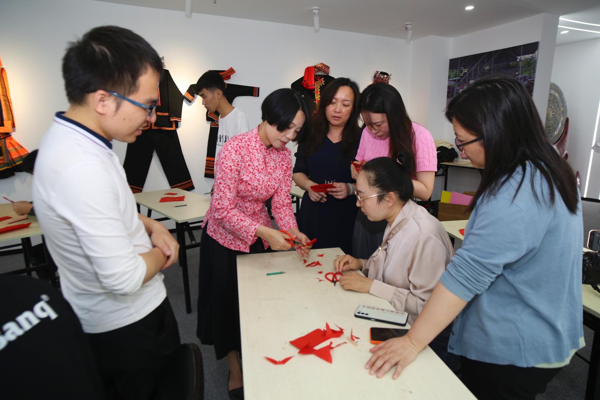 钟昀睿老师在图书馆7楼指导青年教师剪纸技艺