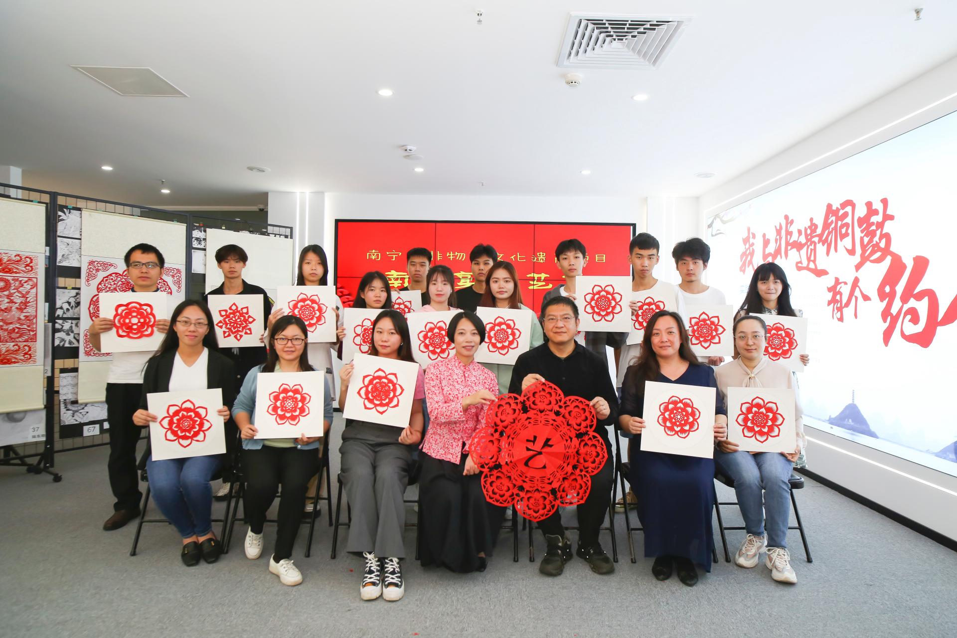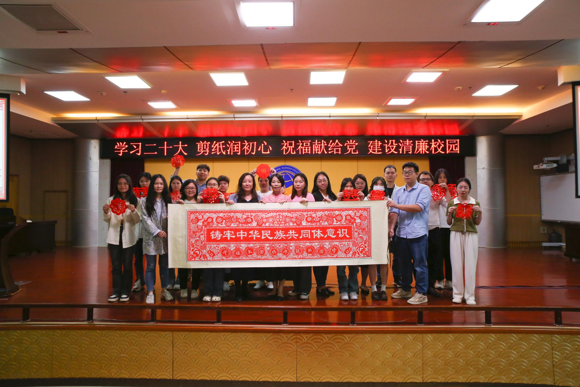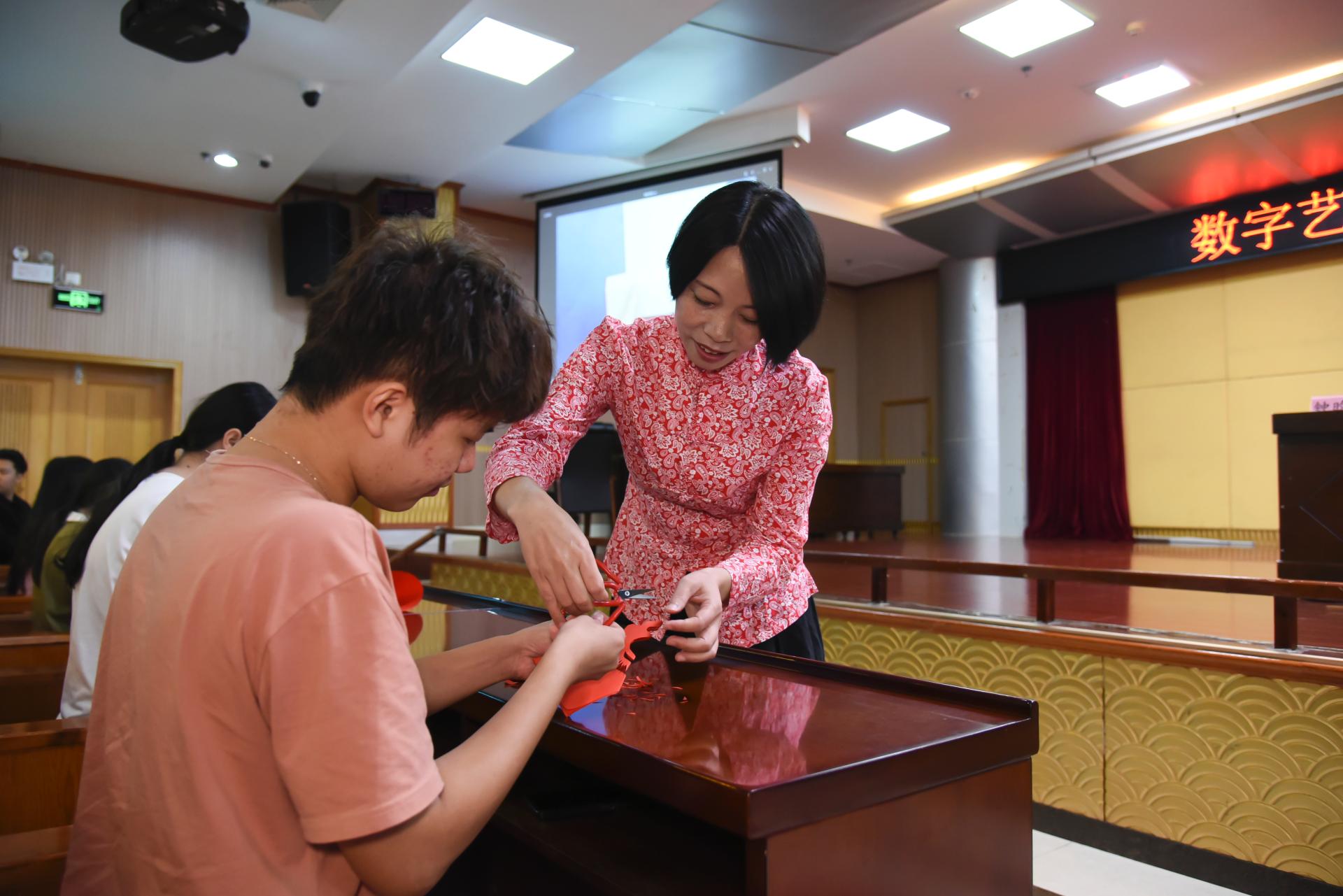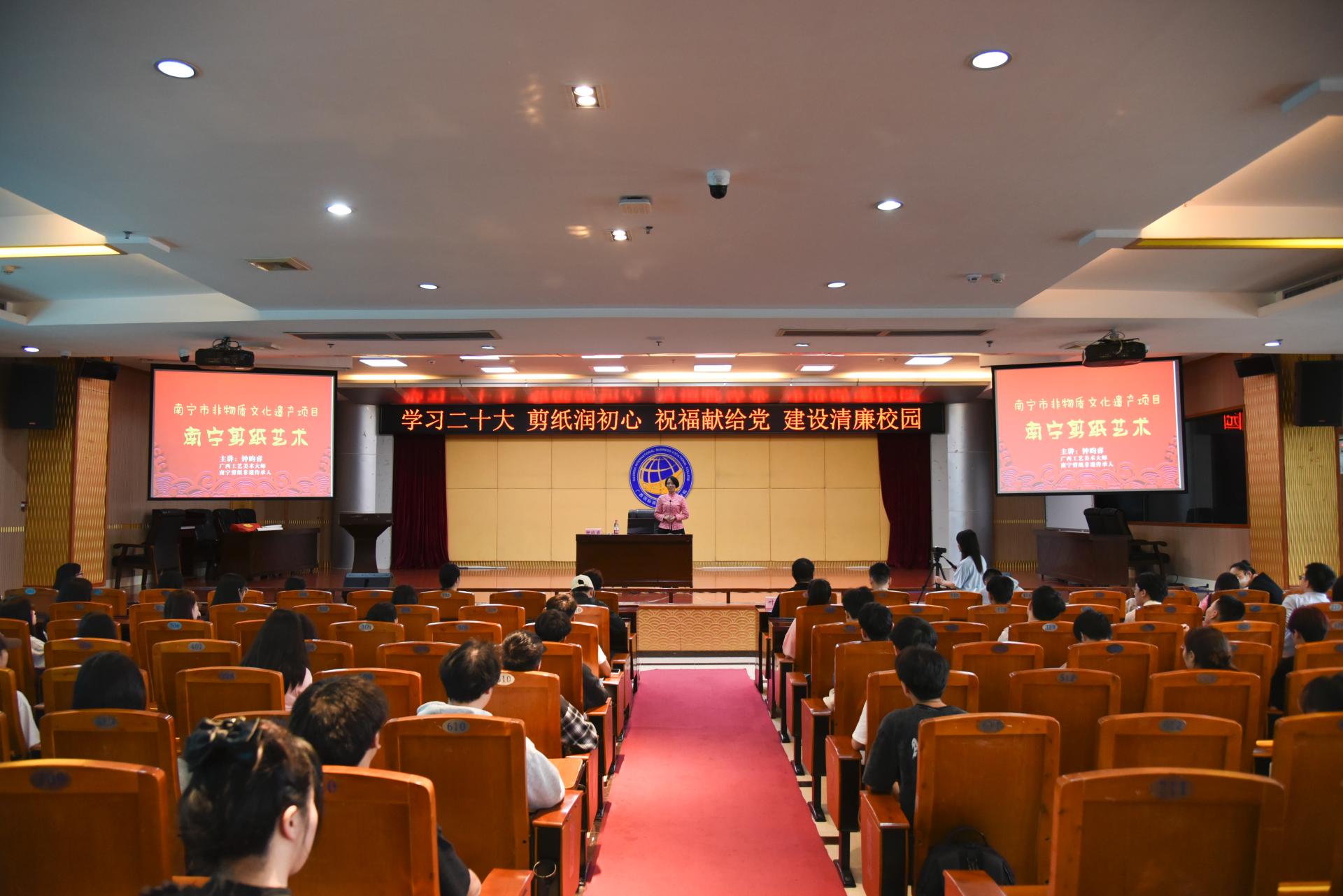 5月9日下午,为学习贯彻党的二十大精神及习近平新时代中国特色社会主义思想主题教育关于“学思想、强党性、重实践、建新工”的总要求,我校数字艺术学院在大学路校区图书馆11楼报告厅及7楼数字媒体创意实训中心,开展了以“学习二十大 剪纸润初心 祝福献给党 建设清廉校园”为主题的剪纸技艺教学与实践活动。本次活动邀请南宁剪纸非物质文化遗产代表性传承人钟昀睿老师,现场向师生展示剪纸艺术的魅力。活动以技能进阶周为平台,将传承和弘扬中华优秀传统文化与专业教学相融合,在实践中增强文化自信。数字艺术学院副院长叶军、教师代表及300余名学生参加此次活动。