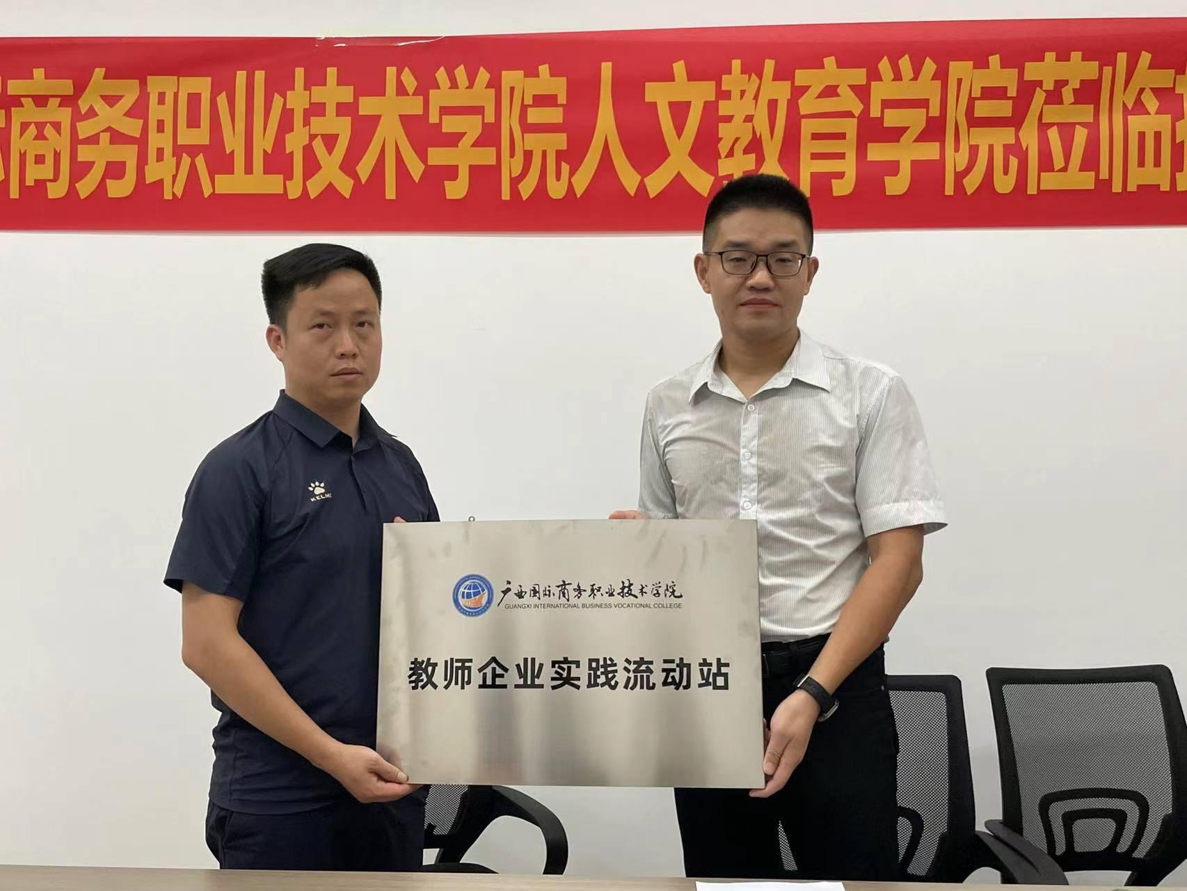 7月5日上午,人文教育学院教师企业实践基地和教师企业实践流动站挂牌仪式分别在广西乐达传媒有限公司和南宁多威体育用品有限公司举行。人文教育学院院长张海涛、体育教研室主任林育威、基础教研室主任梁丽莉、李涵旭老师以及两家企业方的领导和代表参加了挂牌仪式。
