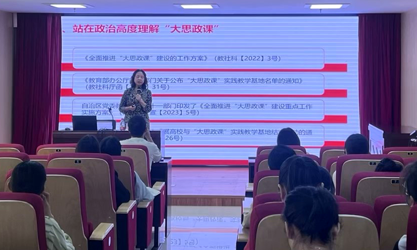 随后,戴燕玲作了题为《对“大思政课”实践教学的几点思考》的讲座。她指出,首先要站在政治高度理解“大思政课”,深入贯彻落实习近平总书记关于“大思政课”的重要指示批示和教育部、自治区党委教育工委等相关文件精神,准确把握“大思政课”的本质、内容和形式。其次,针对如何构建“大思政课”提出了4点思考:一是紧扣学校专业特色;二是善构实践育人大师资;三是善搭社会大资源平台;四是善讲思政实践大课。最后,戴燕玲介绍了广西卫生职业技术学院在“大思政课”建设方面取得的成效。整场报告理论与实际相结合,深入浅出、旁征博引,既有经验总结,又有案例剖析。参加会议的老师们纷纷表示对“大思政课”的内涵有了更加深刻的了解,对后续探索思政课实践教学方式有了更深的思考。
