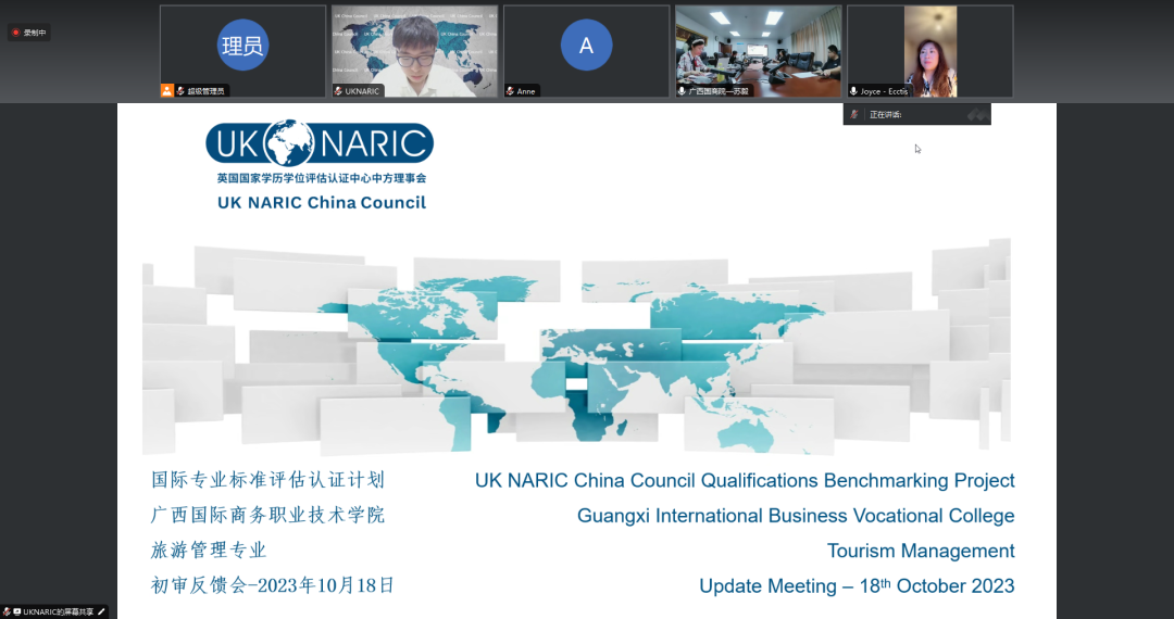 2023年10月18日,我校与英国国家学历学位评估认证中心举行旅游管理专业的国际专业标准评估认证初审反馈会,反馈会通过线上会议方式进行。文化与旅游学院院长莫颖及评估认证团队相关成员在2-410会议室参加了此次初审反馈会。