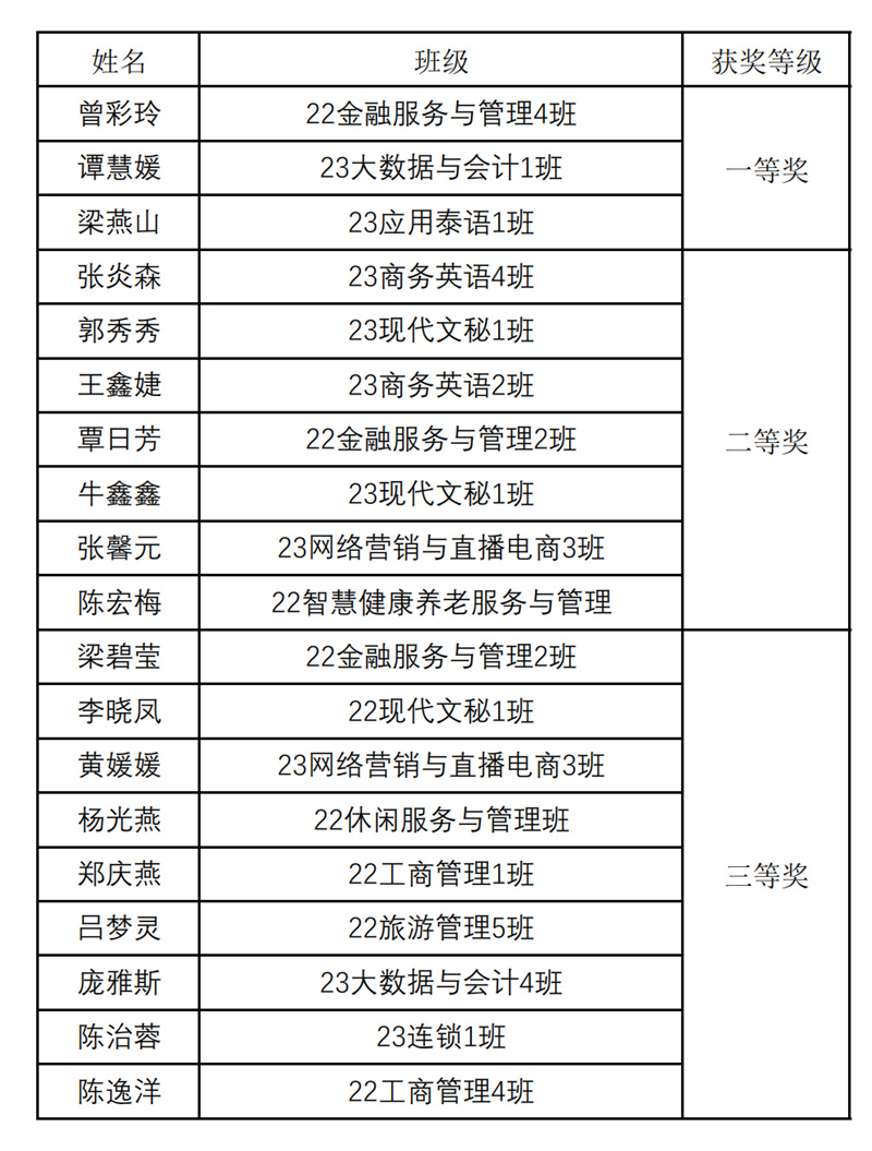 经过激烈角逐,最终23大数据与会计1班谭慧媛等三位选手荣获一等奖,22金融服务与管理2班覃日芳等7名选手获得二等奖、23级网络营销与直播电商3班黄媛媛等9名选手获得三等奖。