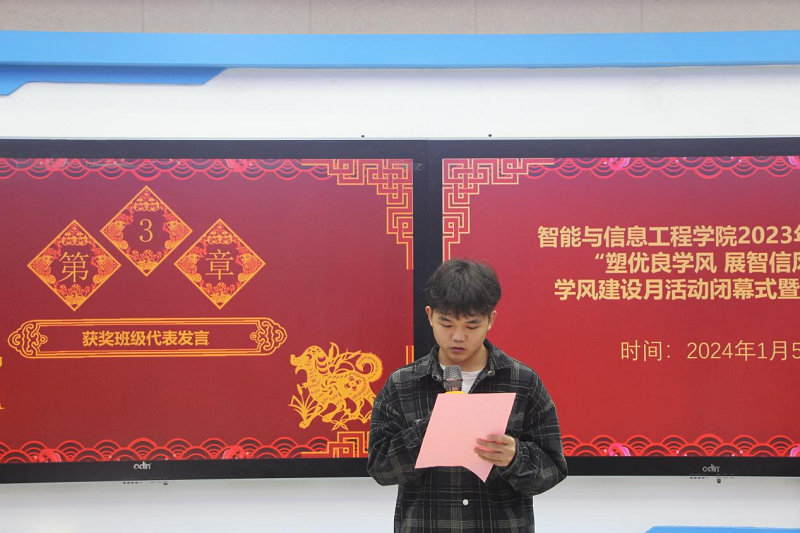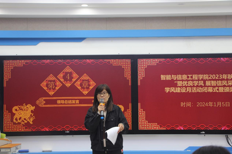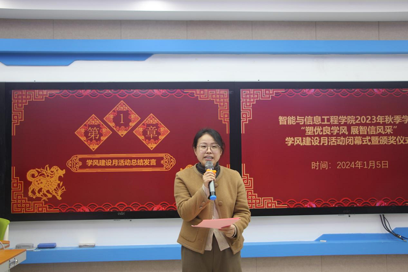 为深入学习贯彻党的二十大精神,全面落实立德树人根本任务,进一步加强学院学风建设,提高学生学习积极性和主动性,我校智能与信息工程学院开展了学风建设月系列活动,目前该活动已圆满结束。1月5日中午,智能与信息工程学院在大学路校区4-201教室召开了2023年秋季学期“塑优良学风 展智信风采”学风建设月活动闭幕式暨颁奖仪式。学院党总支专职副书记潘慧妮、副院长周菊瑄,学院全体辅导员及学检部成员、全体纪检委员和获奖同学参加了此次闭幕式。