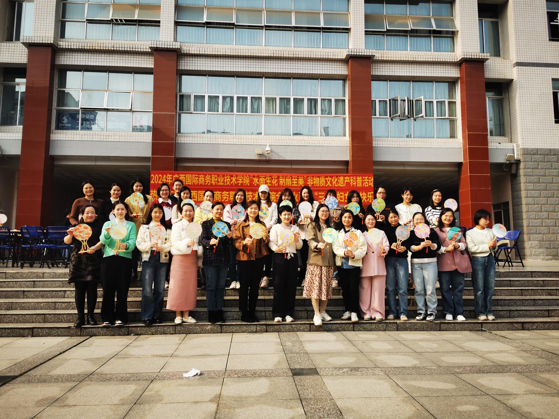 为进一步弘扬中华民族传统文化,展现我校女职工新时代女性的风采,3月7日,在第114个“三八”国际妇女节来临之际,学校分别在东盟校区、大学路校区组织开展“水面生花制扇至美”非物质文化遗产科普活动。