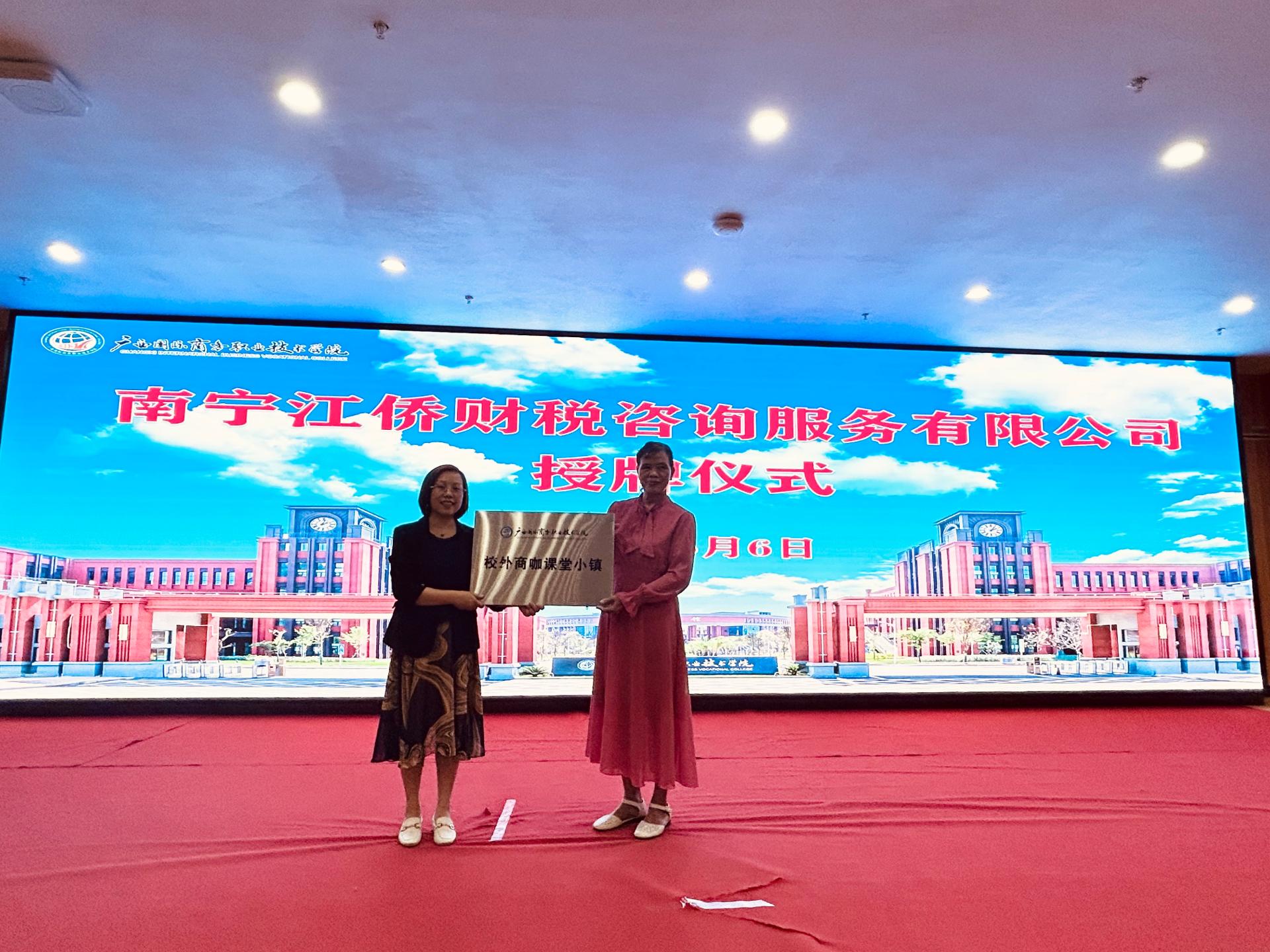 在开班仪式上,会计学院向南宁江侨财税咨询服务有限公司进行了“校外商咖课堂小镇”授牌,标志着会计学院在校企合作和产教融合方面又迈出了重要的一步。