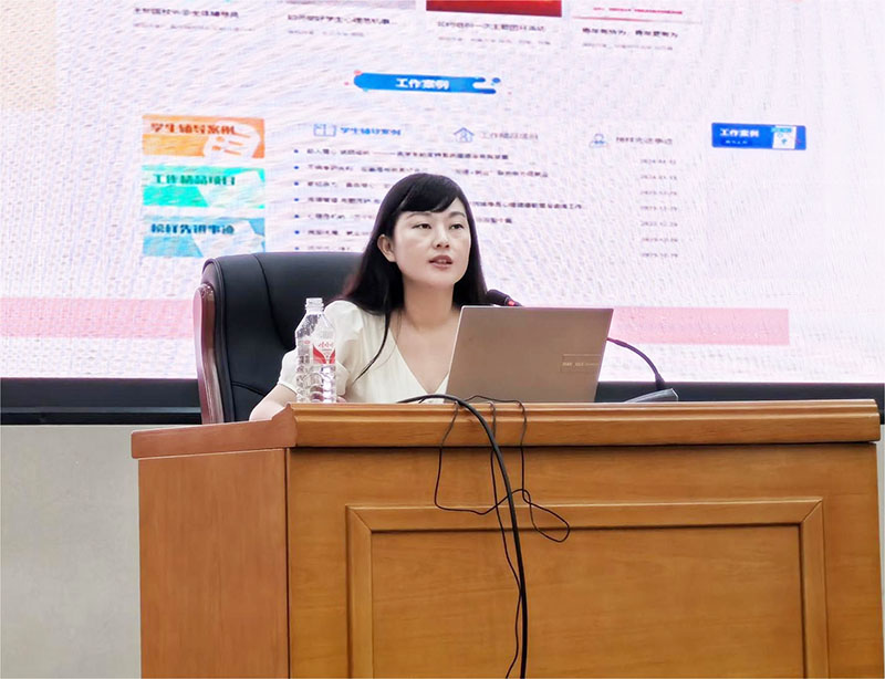 宫婷婷介绍了辅导员工作室发展背景和发展历程,以辅导员的十大育人体系、九大职能标准作为切入点讲解辅导员品牌化建设的方向。她以自身的工作室建设为例,深入浅出地阐述了品牌打造与特色塑造的重要性及实施策略。首先她指出个人品牌与团队品牌是相辅相成的,品牌的打造和特色塑造需要注重团队的孵化和培育。其次,高校辅导员名师工作室建设要有自己的理念,把理念深入到工作中,形成师生学习成长共同体。接着,她从“文化赋能、机制赋能、数智赋能、名师赋能”四个方面深入阐述了高校辅导员名师工作室的实现路径。最后,她分享了个人工作室的未来发展方向和实施路径,为与会人员提供了宝贵的参考和启示。互动环节中,参会辅导员代表纷纷就自身工作室品牌打造和特色塑造的问题以及辅导员工作室建设内生动力内容积极进行探讨,宫婷婷耐心解答,并提出了针对性的建议和指导。她鼓励大家要敢于创新、勇于实践,不断探索适合自身工作室发展的路径。