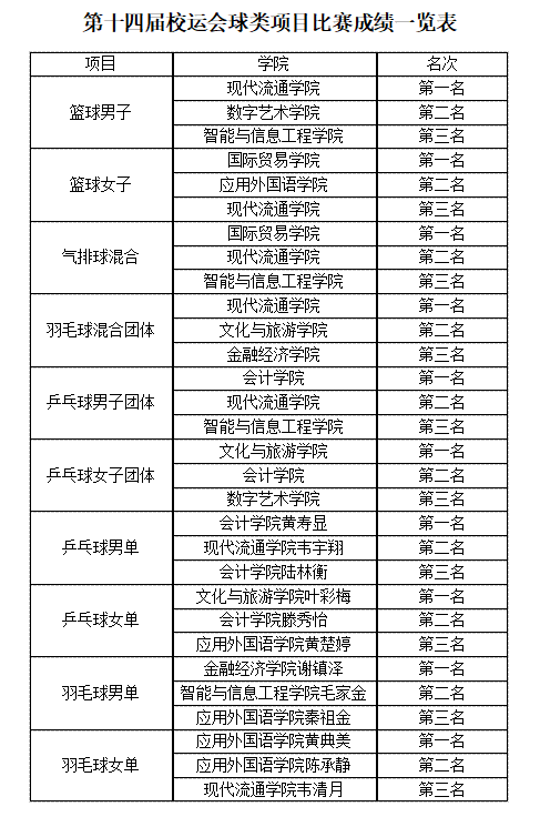 经过激烈角逐,我校现代流通学院获男子篮球冠军、羽毛球团体冠军;国际贸易学院获女子篮球冠军、气排球混合冠军;会计学院获乒乓球男子团体冠军;文化与旅游学院获乒乓球团体女子冠军。(具体成绩见附表)