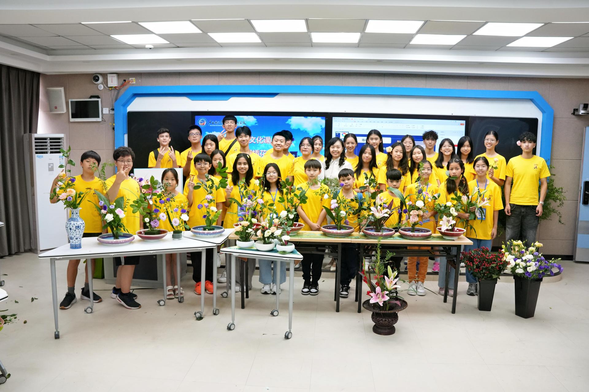 学员们与自己创作的插花作品合影