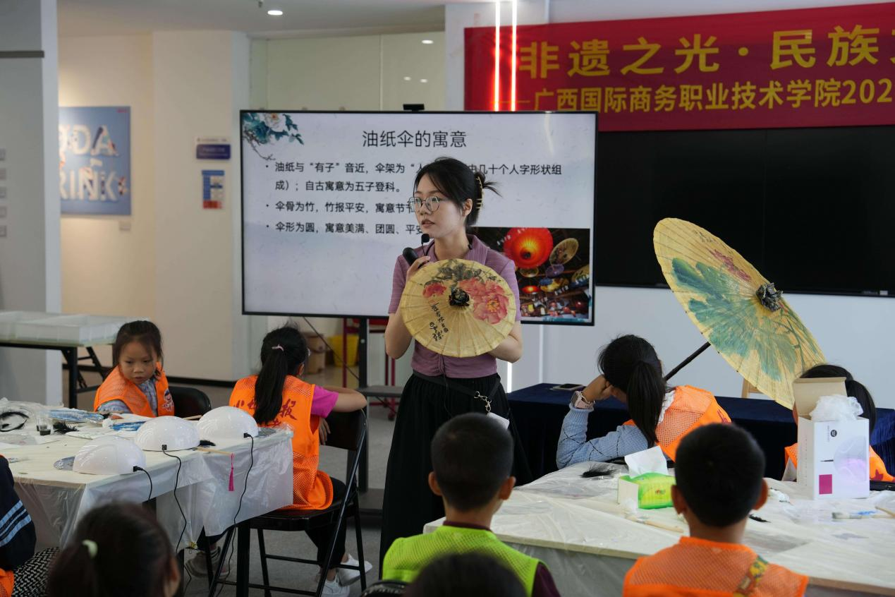 来自现代流通学院的科普讲解员龚意老师开展了非遗技艺——油纸伞非遗知识讲座,并与徐榕锴老师共同带领小学员们开展伞绘手工体验。小学员们在两位老师的指导下为空白伞面绘上图案,并结合中国传统书画形式涂色,最终完成创作。