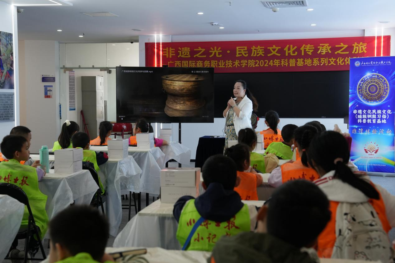 为提升学生的科学文化素质,增强学生对非遗文化和民族文化的认知并传承创新意识,11月9日,学校联合广西科普传播中心(小博士报)读者服务部开展“非遗之光·民族文化传承之旅”科普研学活动。围绕今年的全国科普日活动主题“提升全民科学素质 协力建设科技强国”,活动在学校大学路校区非遗文化民族文化(瑶族铜鼓习俗)科普教育基地举行。来自南宁多所小学的学生及我校科普讲解员、科普志愿者共计40余人参加了本次活动。