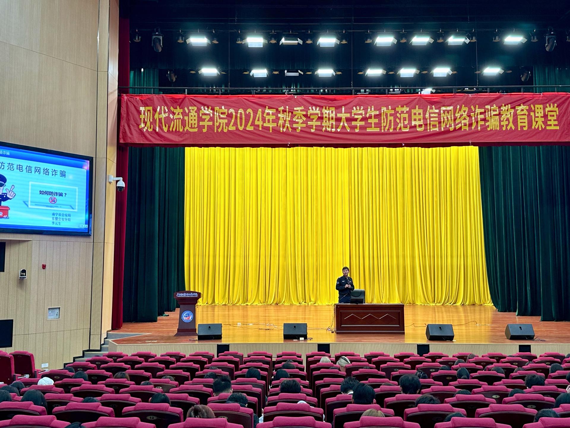 为进一步加强学生的安全防范意识,提升电信网络诈骗的识别和防范能力,11月11日,现代流通学院邀请南宁市公安局东盟公安分局的民警同志走进东盟校区聚学堂,分别为学院2023级、2024级的2700余名学生带来了三场生动而实用的防范电信网络诈骗教育课堂。