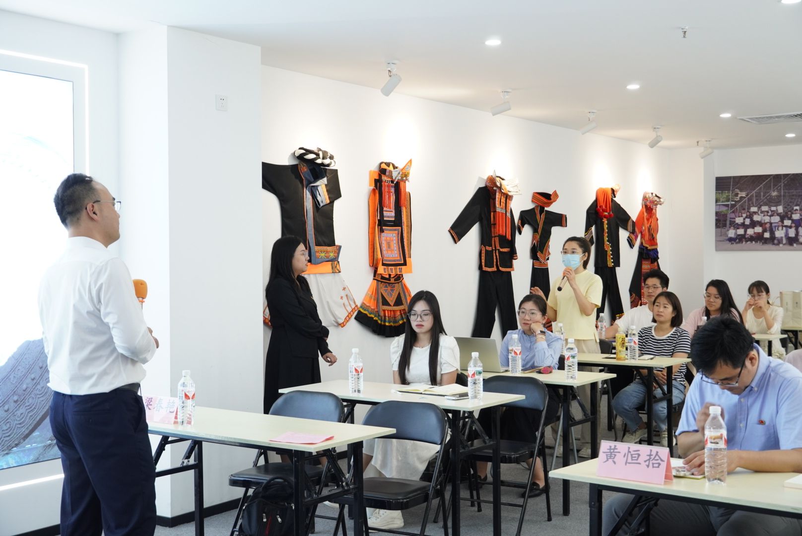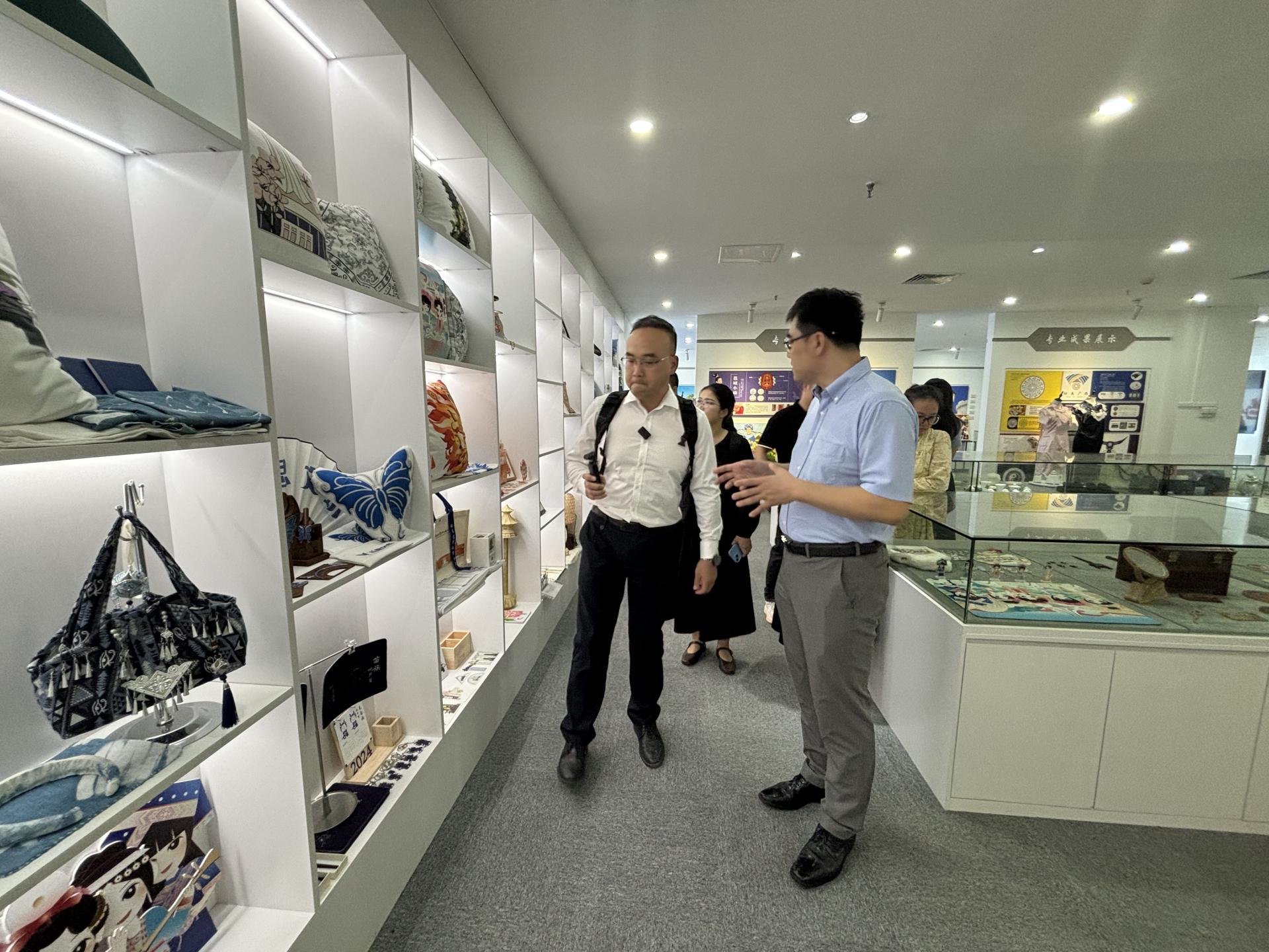 活动开始前,黄恒拾引导嘉宾参观自治区示范性民族文化传承创新职业教育基地,并介绍基地的发展历程、建设情况以及展示厅内陈列的学生文创作品。