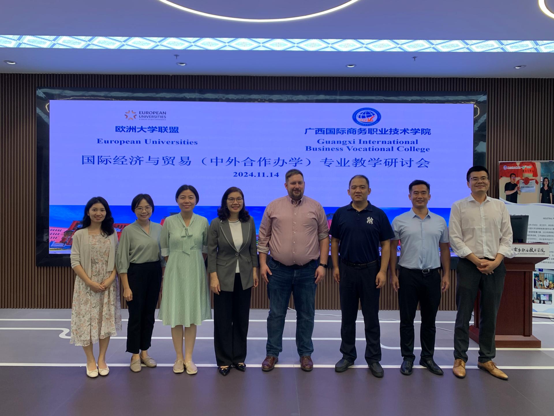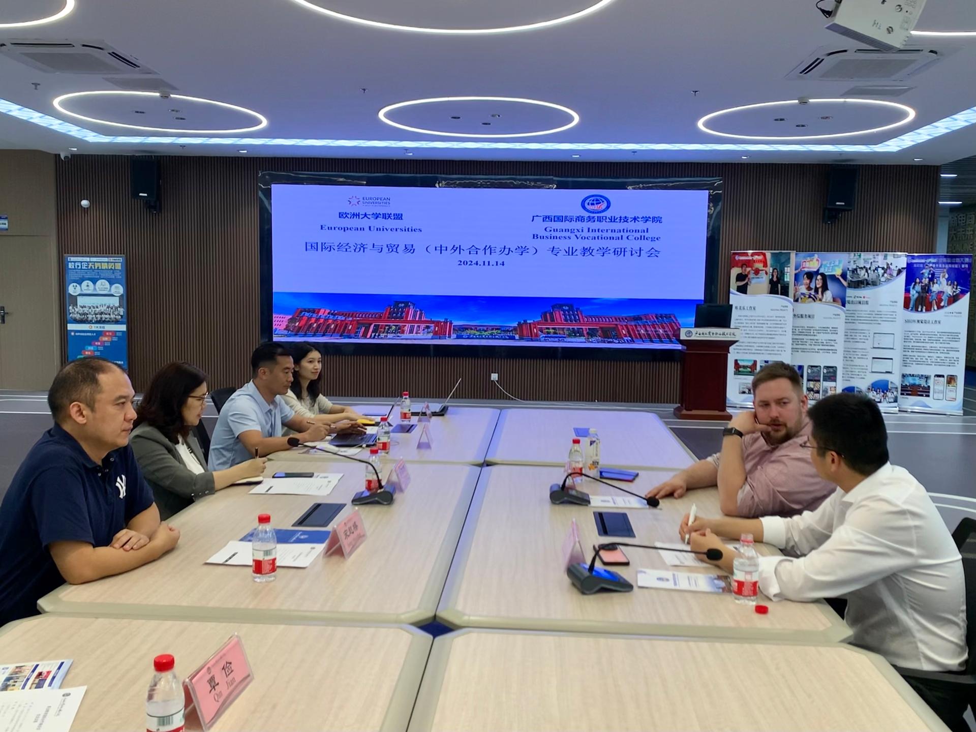 为加快转化我校领导出访德国等欧洲国家的重要成果,推动我校与欧洲国家在教育领域的深度合作,11月14日下午,国际经济与贸易(中外合作办学)专业教学研讨会在我校举行。欧洲大学联盟执行总裁、德国管理应用科技大学副校长阿玛迪斯·维尔纳,欧洲大学联盟中国办公室主任李冰,我校国际贸易学院院长邓海涛、国际交流学院副院长宋赵榛以及教师代表参加会议。