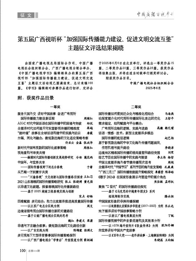 本次征文活动自2024年3月启动以来,共收到来自全国广播电视系统、高校及科研机构的投稿168篇。经专家初评和定评会议严格评审,最终评选出一等奖1篇、二等奖20篇、三等奖25篇。获奖作品将结集出版。