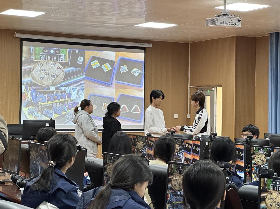 活动伊始,应用外国语学院党总支专职副书记李启程代表学院对到访师生表示热烈欢迎,并结合学校宣传片,生动全面地介绍了学校办学成果、师资力量、专业设置等内容,通过有奖问答的形式让到访师生对应用外国语学院建立起初步认知。简短的欢迎仪式过后,研学团队兵分多路,分组开启智慧口译实训室、感统实训室、感统实训室外走廊绿地等多个实践场地的沉浸式体验之旅。