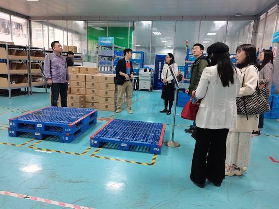 曾超副主任(左一)陪同广西财经学院工商管理学院的老师们一同参观我院物流管理专业实训室