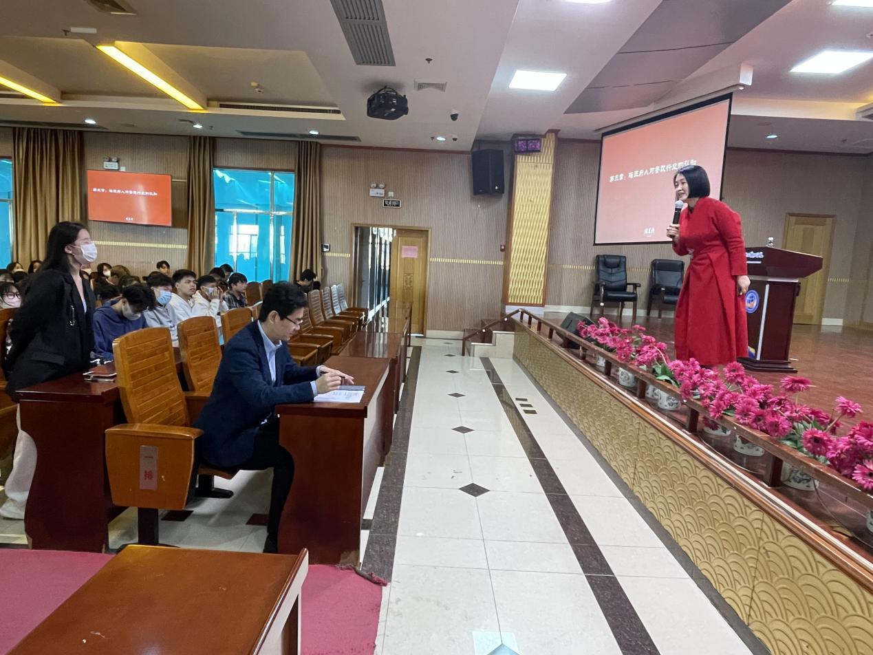 郭艳秋以“幸福企业成就幸福员工”为主题,为与会师生讲述了瑶王府集团的核心价值观和企业的家庭文化:“爱与感恩,简单真实”,“培育爱、传递爱,把员工当家人”给企业员工传递一种积极的、正能量的思想,让员工拥有爱的能力,企业才能越来越好。郭艳秋还分享了企业十几年发展历程,面对疫情和复杂的市场环境,企业用朴实的爱心、积极的行动、暖心的话语,为坚守在一线的广西医科大二附院医护人员送10天爱心午餐;为南宁市各街区环卫工人送上1500份暖餐。一个个感人事迹展现了企业的社会责任和经营智慧,也为在场师生带了企业文化的自信心和正能量。