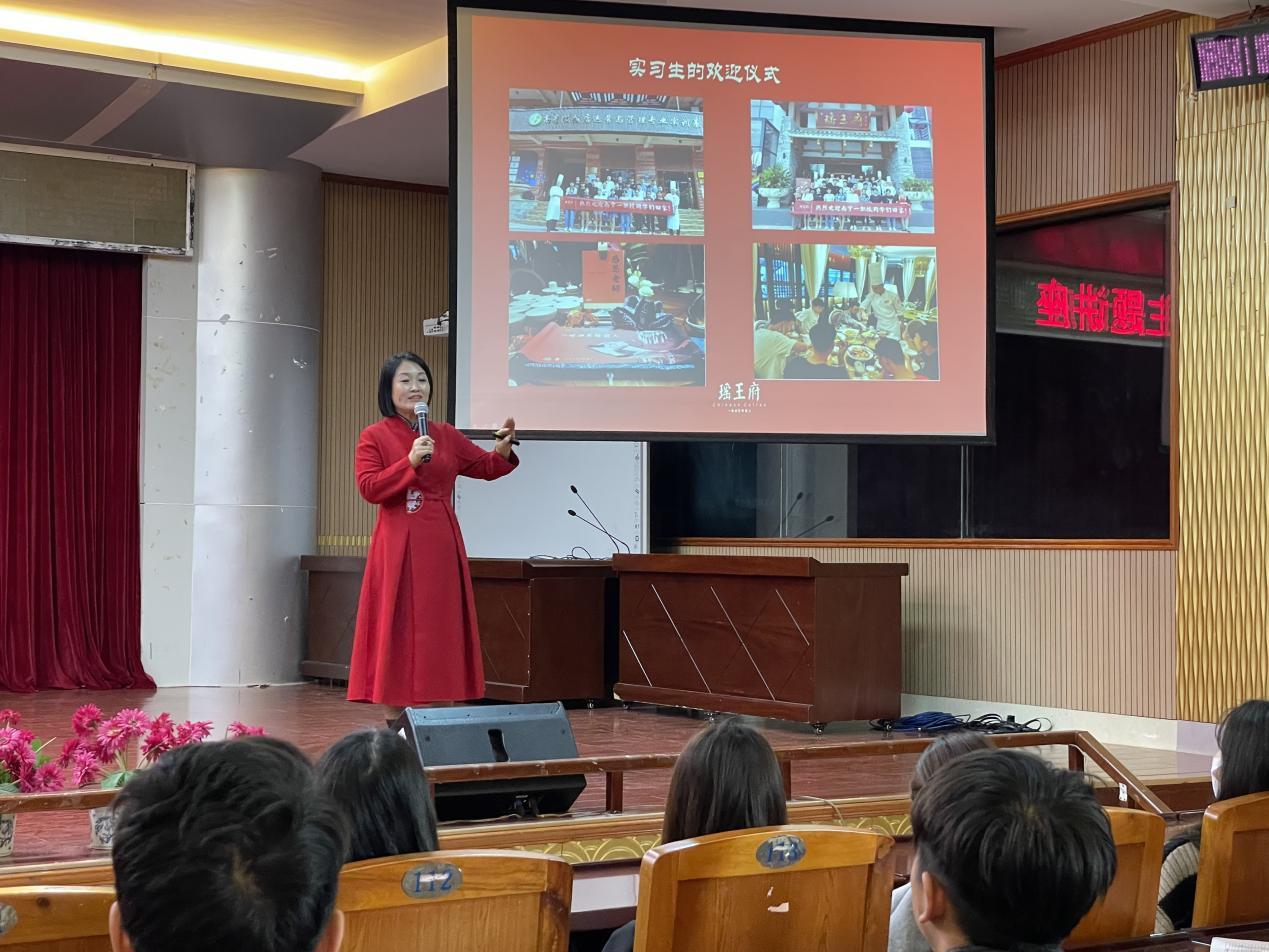 郭艳秋为同学们讲述了如何做好个人的职业发展规划,以及分享在瑶王府的工作生活环境及丰富多彩的业余生活,并与在场学生互动激发学生的兴趣,就学生关心的就业补贴、岗位需求及职业发展等问题予以解答,增强学生与企业之间的交流与了解,实现学校教育和企业需要“零距离”接触。她鼓励在座的同学们努力提升自身专业技能和职业素养,主动了解行业及企业发展趋势,做好明确的职业发展规划,以脚踏实地的心态迈出人生职业路上的第一步。