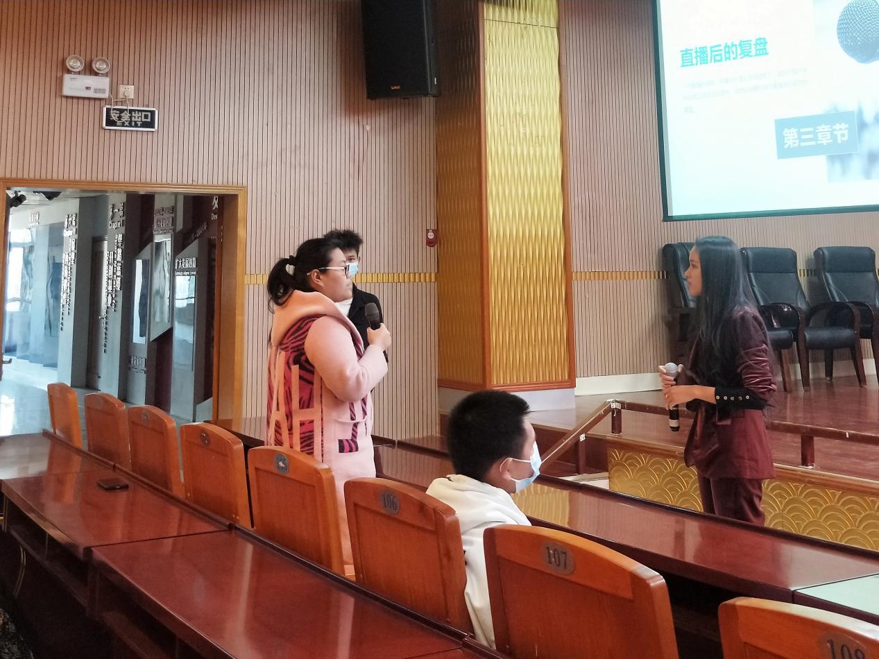 麻沁园老师为同学们分享了直播工作需要做的准备工作、主播期间侧重点以及结束后的复盘,给大家详细介绍了“优秀主播必备的11种习惯、主播成交的9个逻辑、直播间促成成交的5个细节、粉丝获取留存的8个技巧”等。她从当前的实事热点出发,结合主播带货中的难点,理论讲解与案例呈现相结合,深刻剖析当下火热的直播新生态。在如何做好直播带货上,首要任务是获得用户,紧接着做好选品及选品的包装、合作推广,建立主播与用户的信任,打造直播氛围,同时选择好带货渠道。目前直播带货成为越来越多学生求职选择的方向,如何更有效、更充分地利用短视频平台的功能来实现营销的目的,更好地抓住短视频风口下的机遇,这也让同学们有了更深入的启发和思考。