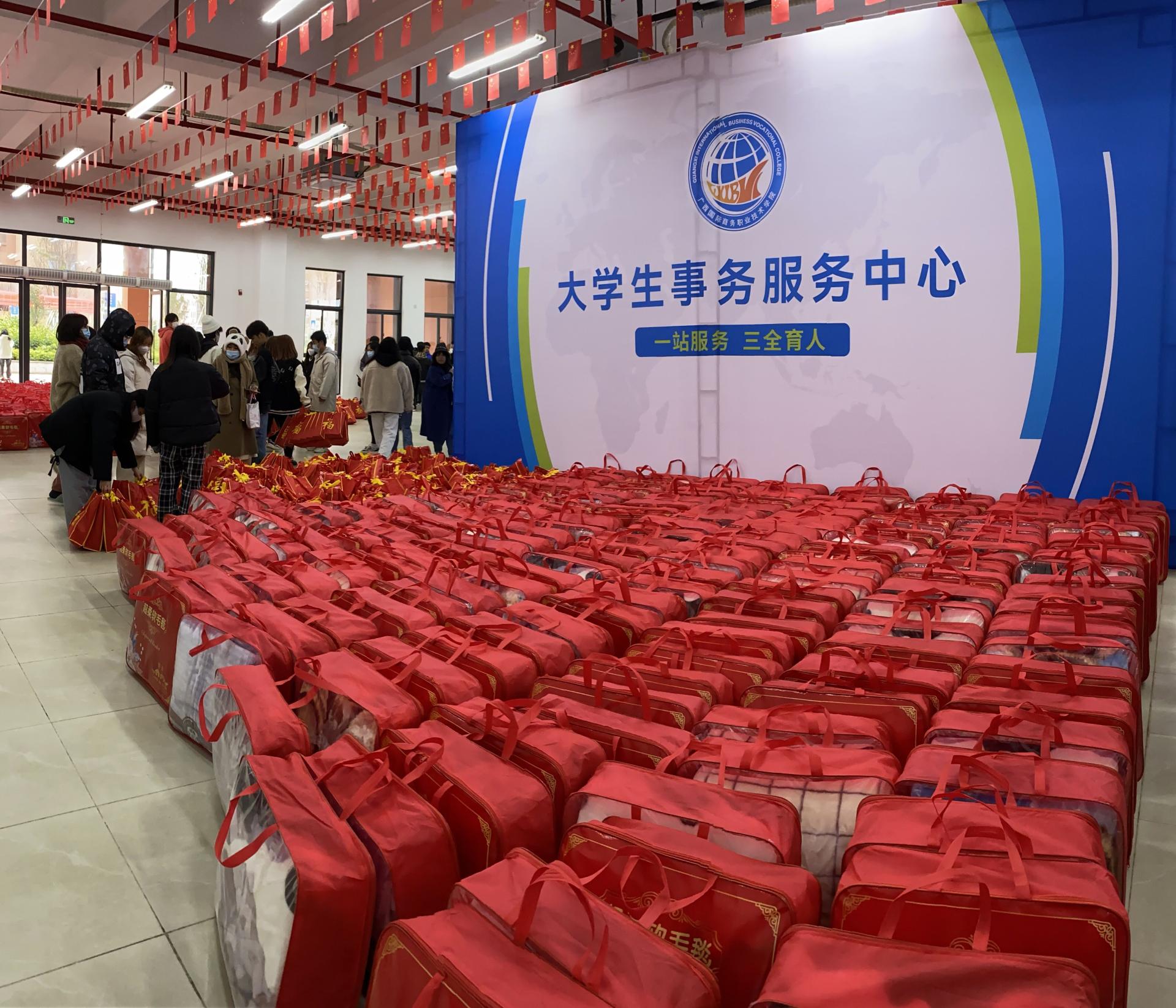 大学生资助中心先后于12月24日、28日在我校大学路校区、东盟校区举办慰问活动,为2021级通过家庭经济困难认定但未获国家资助的998名学生发放寒假返乡路费补助;为2021级1421名家庭经济特别困难的学生发放防疫物品、年货以及御寒毛毯等“双节”慰问品,让学生体会来自学校的关心关爱。