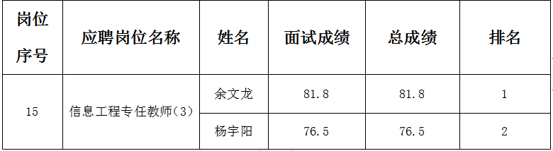 根据《广西国际商务职业技术学院2021年度第一期公开招聘非实名人员控制数公告》安排,我院于2021年6月25日组织信息工程专任教师(3)岗位总成绩末位并列的两名考生进行再次面试,现将面试成绩及总成绩予以公布。