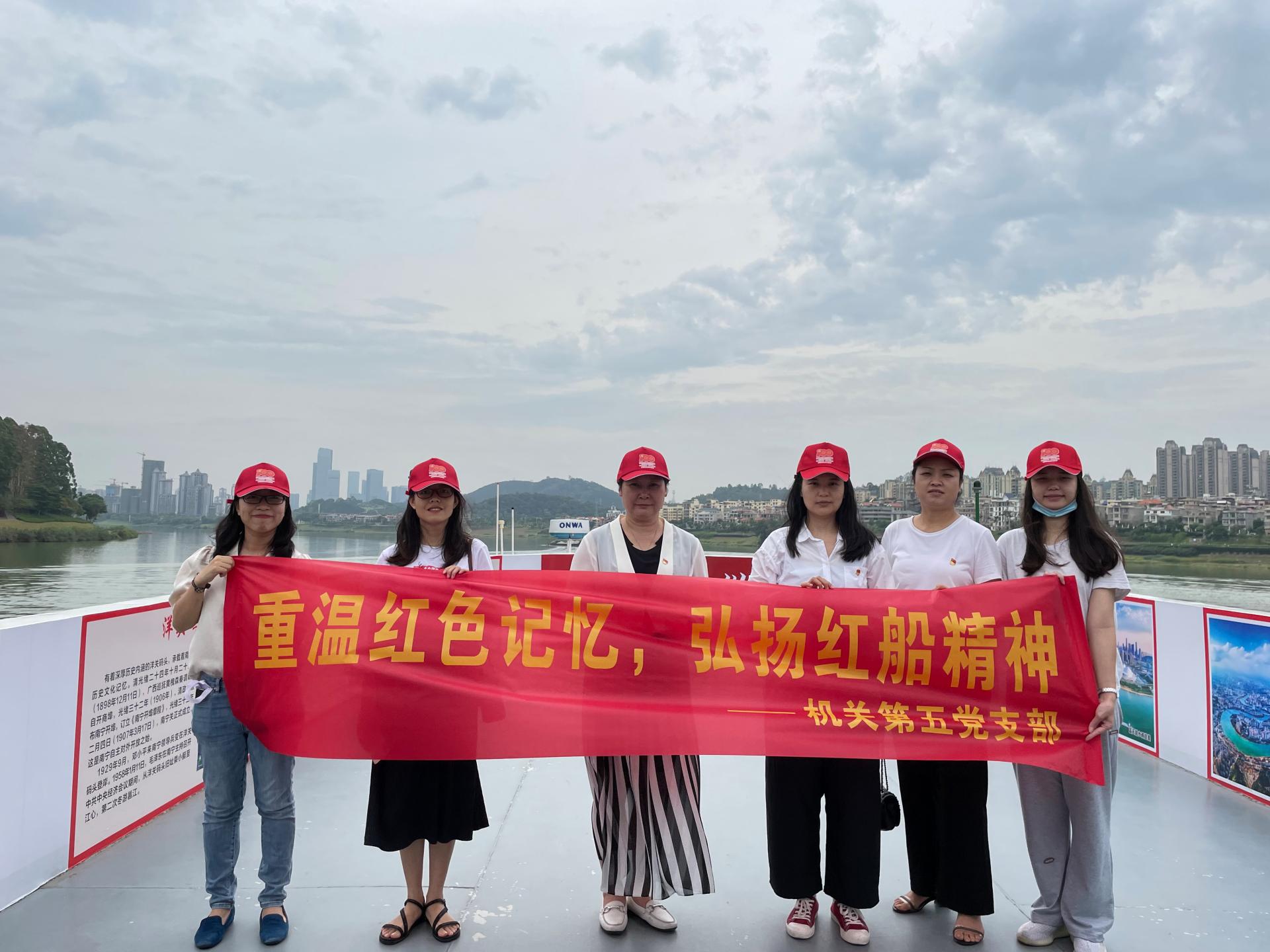 为了从党的百年伟大奋斗历程中汲取继续前进的智慧和力量,深入开展党史学习教育,回顾党的光辉历程,传承红色基因,沉浸式的感受中国革命精神之源——“红船精神”的深刻内涵。5月下旬,机关第五党支部来到邕江,共同登上了“邕江红色主题游船”,开展“重温红色记忆,弘扬红船精神”主题党日活动。