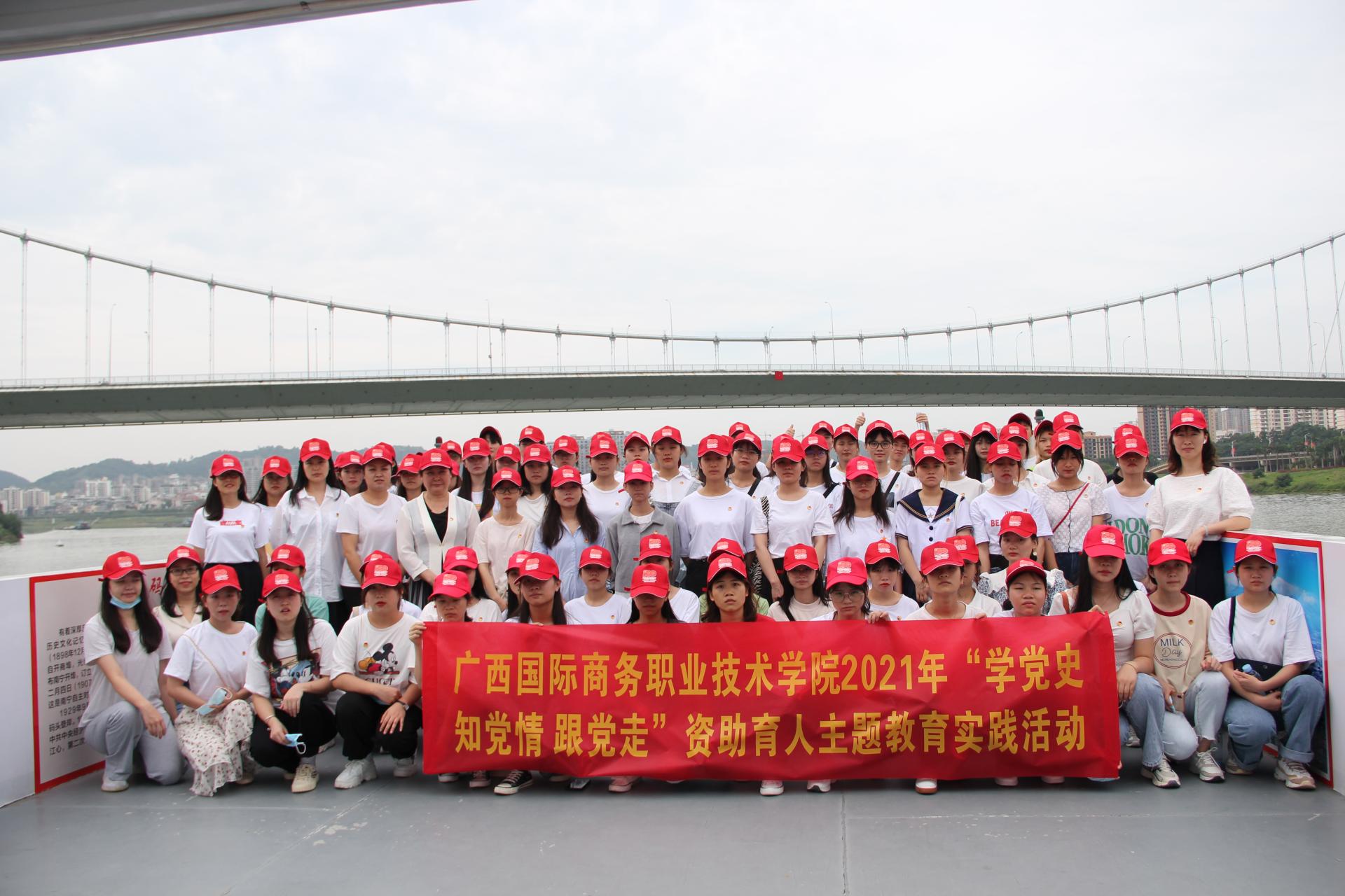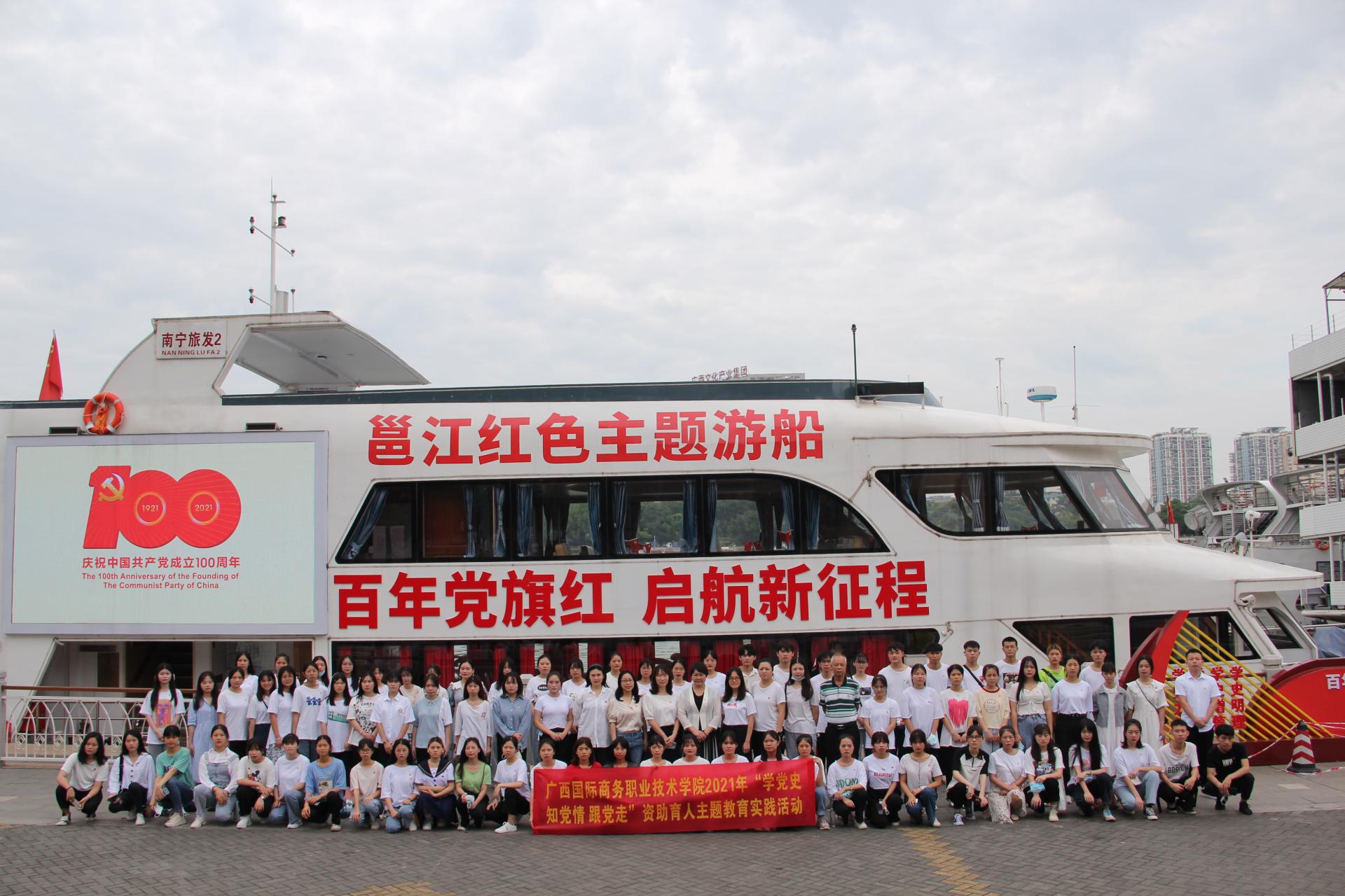 “没有共产党,就没有新中国......”一阵阵激昂嘹亮的歌声从邕江江畔传来。5月下旬,为加强受资助学生党史教育,用党的奋斗历程和伟大成就鼓舞斗志、明确方向,用党的光荣传统和优良作风坚定信念、凝聚力量,用党的实践创造和历史经验启迪智慧、砥砺品格,学院大学生资助中心组织近百名受资助学生登上邕江红色主题游船,开展“百年党旗红 启航新征程”重温“红船精神”资助育人主题教育实践活动。学院学生工作部(处)、大学生资助中心全体教师一同参加本次活动。