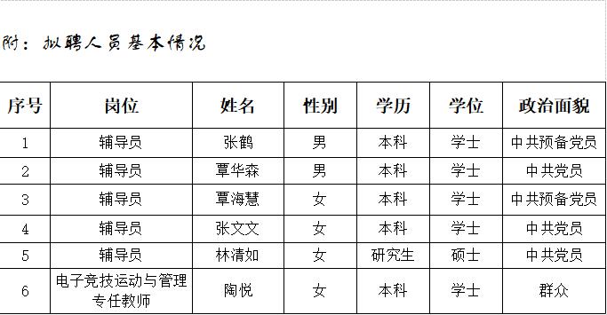根据我校2021年度教师队伍建设需求,经研究决定,拟聘用张鹤等6名同志。现将具体名单予以公示,公示期为7个工作日(2021年9月18日-9月28日),如有异议,请以书面形式,并署真实姓名和联系方式,于2021年9月28日17:00前直接送达我校人事处办公室。