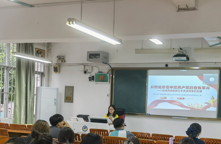 11月22日下午,现代流通学院党总支专职副书记陈颖在大学路校区4-208教室进行宣传贯彻党的二十大精神专题党课,党课主题为“从新党章看中国共产党的自我革命”,教工支部和学生支部党员教师、学院部分非党员教师通过线上和线下的形式参与了党课。党章是党的总章程,是党的根本大法,陈颖全面介绍了党的二十大主要内容和党章的作用,梳理了百年来中国共产党章程历次制定及修正的情况,解读二十大党章修正案的内容和意义,重点学习“二十大党章首次写入‘自我革命’”的重大意义。勇于自我革命,是我们党区别于其他政党的显著标志,揭示了党长盛不衰、风华正茂的奥秘所在,她要求学院全体教师务必发扬“自我革命”的精神,才能在各项工作中不断取得新进步。