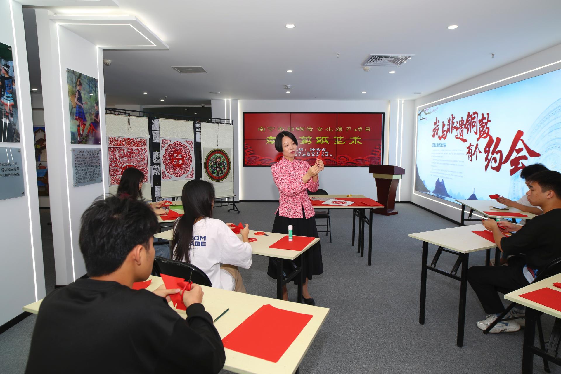 结合传承中国优秀传统文化,推进非遗技艺进校园的要求,学院在技能进阶周期间还开展了以“学习二十大 剪纸润初心 祝福献给党 建设清廉校园”为主题的剪纸技艺教学与实践活动。本次活动邀请南宁剪纸非物质文化遗产代表性传承人钟昀睿老师,现场向师生展示剪纸艺术的魅力。将传承和弘扬中华优秀传统文化与专业教学相融合,在实践中增强文化自信。