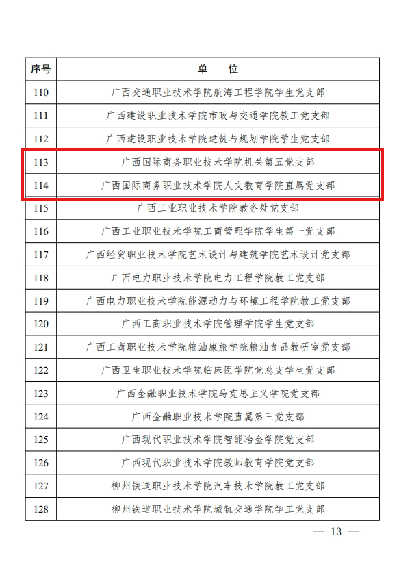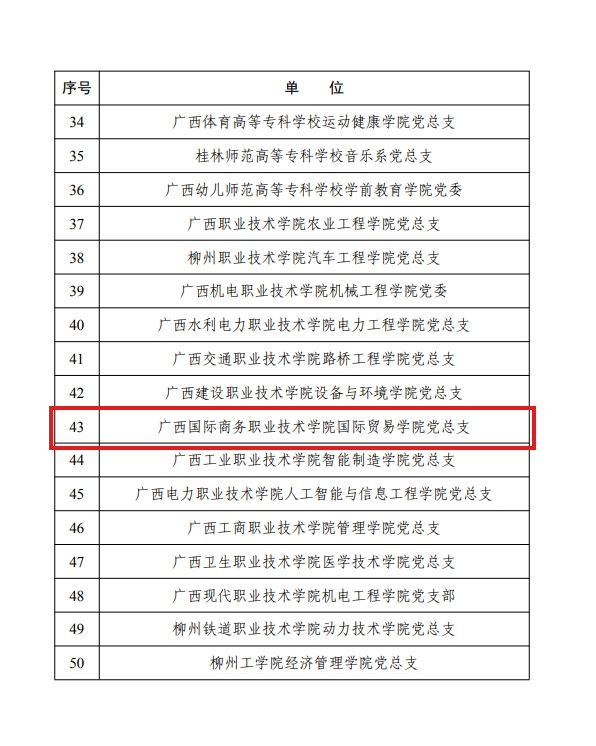 近日,自治区党委教育工委公布了第二批新时代广西高校党建示范创建和质量创优工作培育创建单位名单,我校国际贸易学院党总支入选第二批新时代广西高校党建工作标杆院系培育创建单位,机关第五党支部、人文教育学院直属党支部入选第二批新时代广西高校党建工作样板支部培育创建单位。近年来,学校基层党组织不断加强党的政治建设,切实增强基层党组织政治功能和组织功能,充分发挥战斗堡垒作用和党员先锋模范作用,着力发挥政治引领、规范党的组织生活、团结凝聚师生、促进学校中心工作等方面的主体作用,抓党建促学校发展取得较好成效。