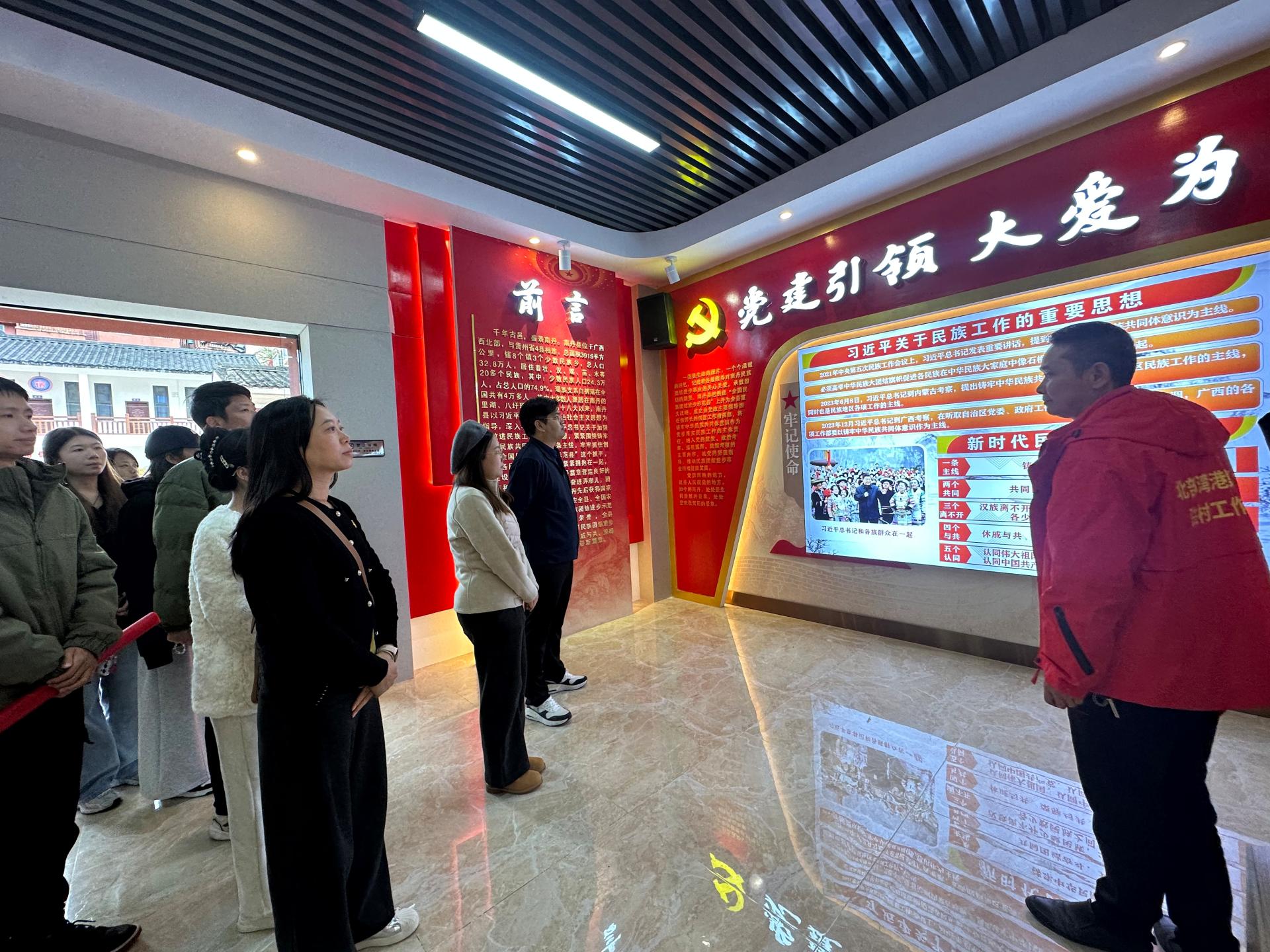 当日下午,师生一行来到南丹县里湖瑶族乡朵努社区,参观南丹县铸牢中华民族共同体意识宣传教育实践基地。在展厅内,南丹县里湖瑶族乡朵努社区工作人员为大家介绍了朵努社区的基本情况和未来发展的趋势。通过政府易地搬迁和旅游项目的开发,上万白裤瑶群众住上了“别墅楼”,改变了深度贫困的旧貌,呈现出如今“千家瑶寨,万户瑶乡”的新景象。