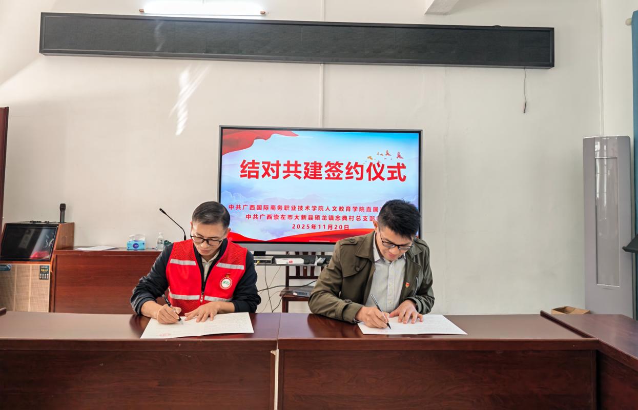 为进一步加强党员爱国主义教育,以高质量党建引领校村协同发展,助力边境乡村振兴,11月20日,人文教育学院直属党支部“强国行”专项行动团队前往崇左市大新县硕龙镇念典村,开展系列党建活动,并与念典村党总支部举行结对共建签约仪式。人文教育学院直属党支部书记张海涛、机关第七党支部书记冯婧、念典村第一书记李均、工作队员张长浦以及第三方党员代表共同参与。