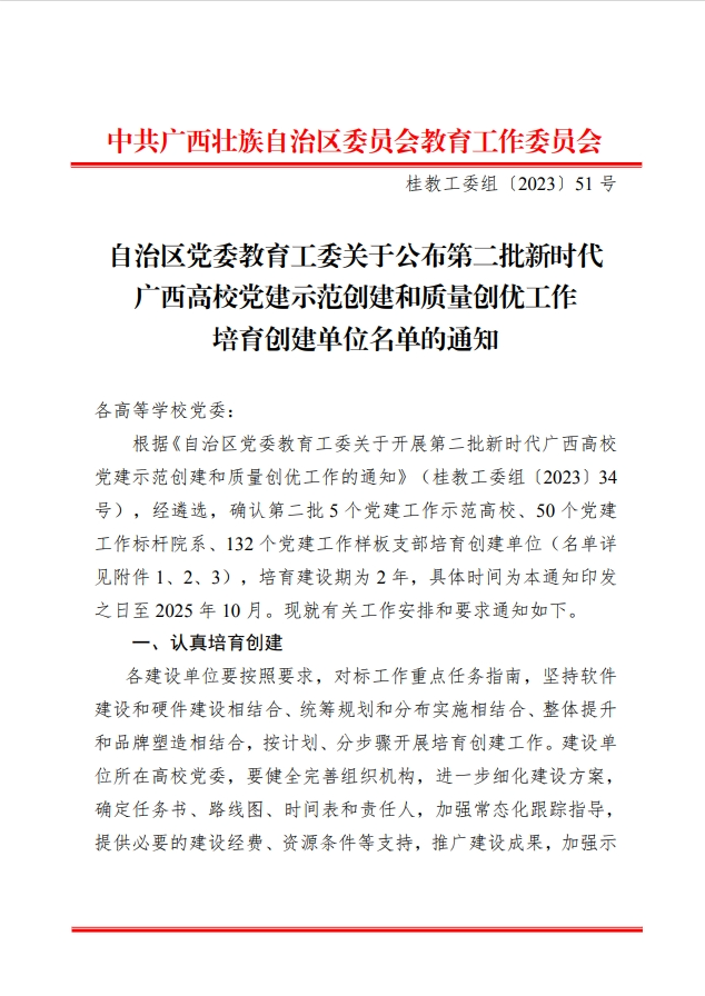 近日,自治区党委教育工委公布了第二批新时代广西高校党建示范创建和质量创优工作培育创建单位名单,我...