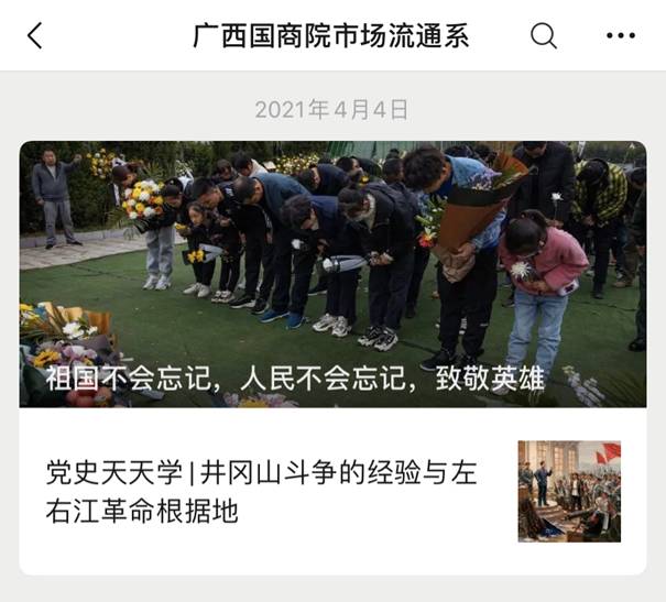 近日,市场流通系根据学院党委关于党史学习教育工作的部署,举办“清明祭英烈”系列活动,通过先后在...