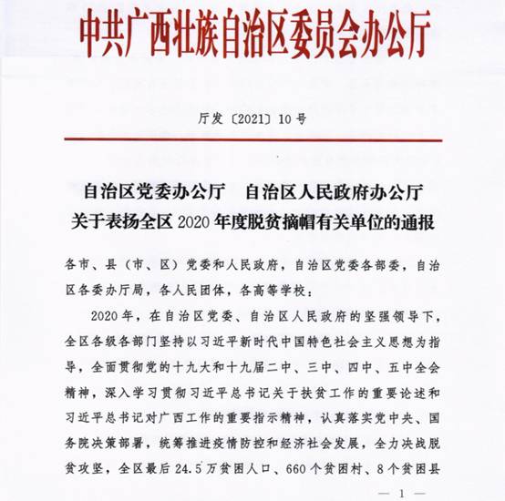 根据《自治区党委办公厅 自治区人民政府办公厅关于表扬全区2020年度脱贫摘帽有关单位的通报》(厅发〔...