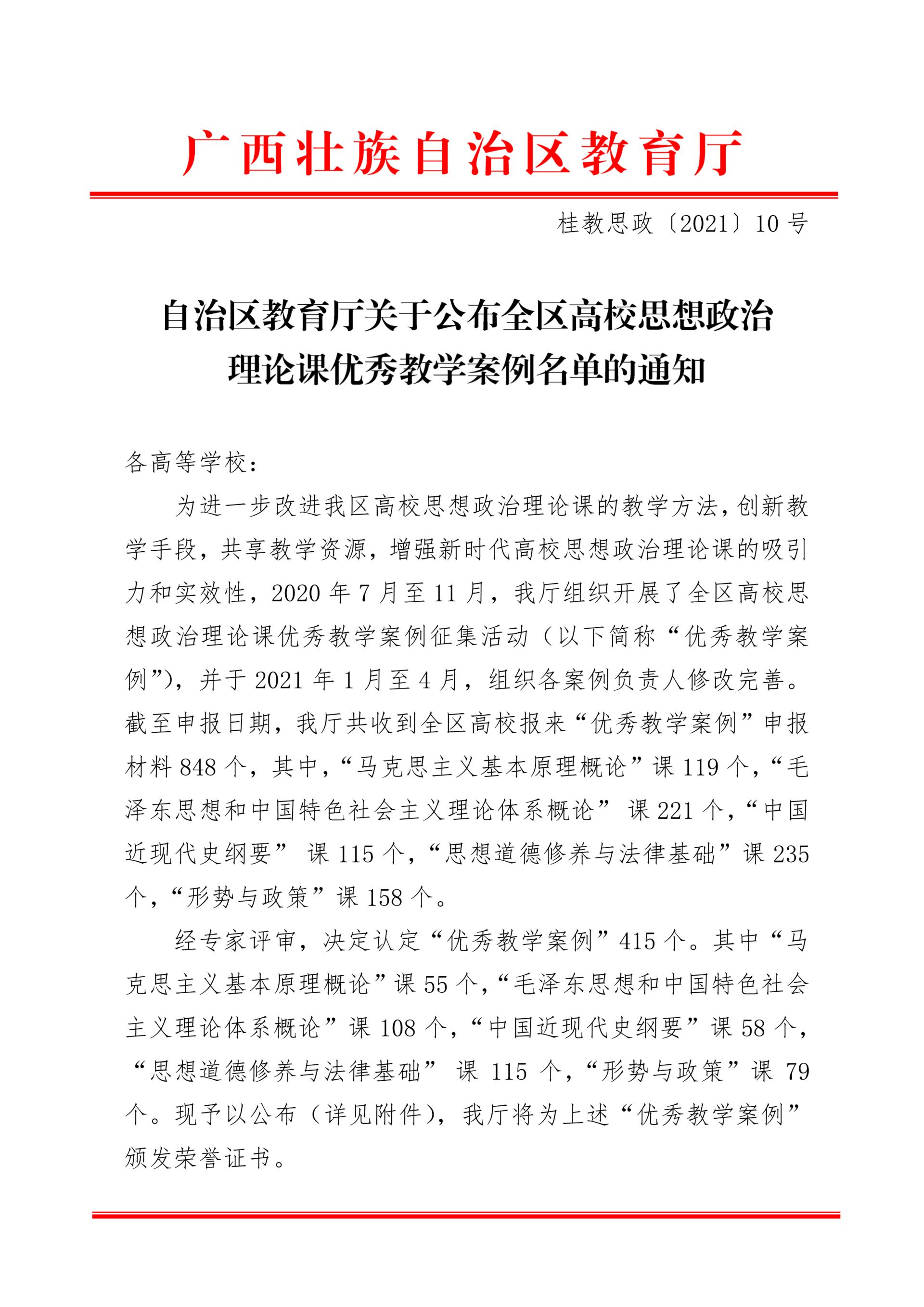 近日,广西壮族自治区教育厅公布的全区高校思想政治理论课优秀教学案例评审中,我院思想政治理论课教学...