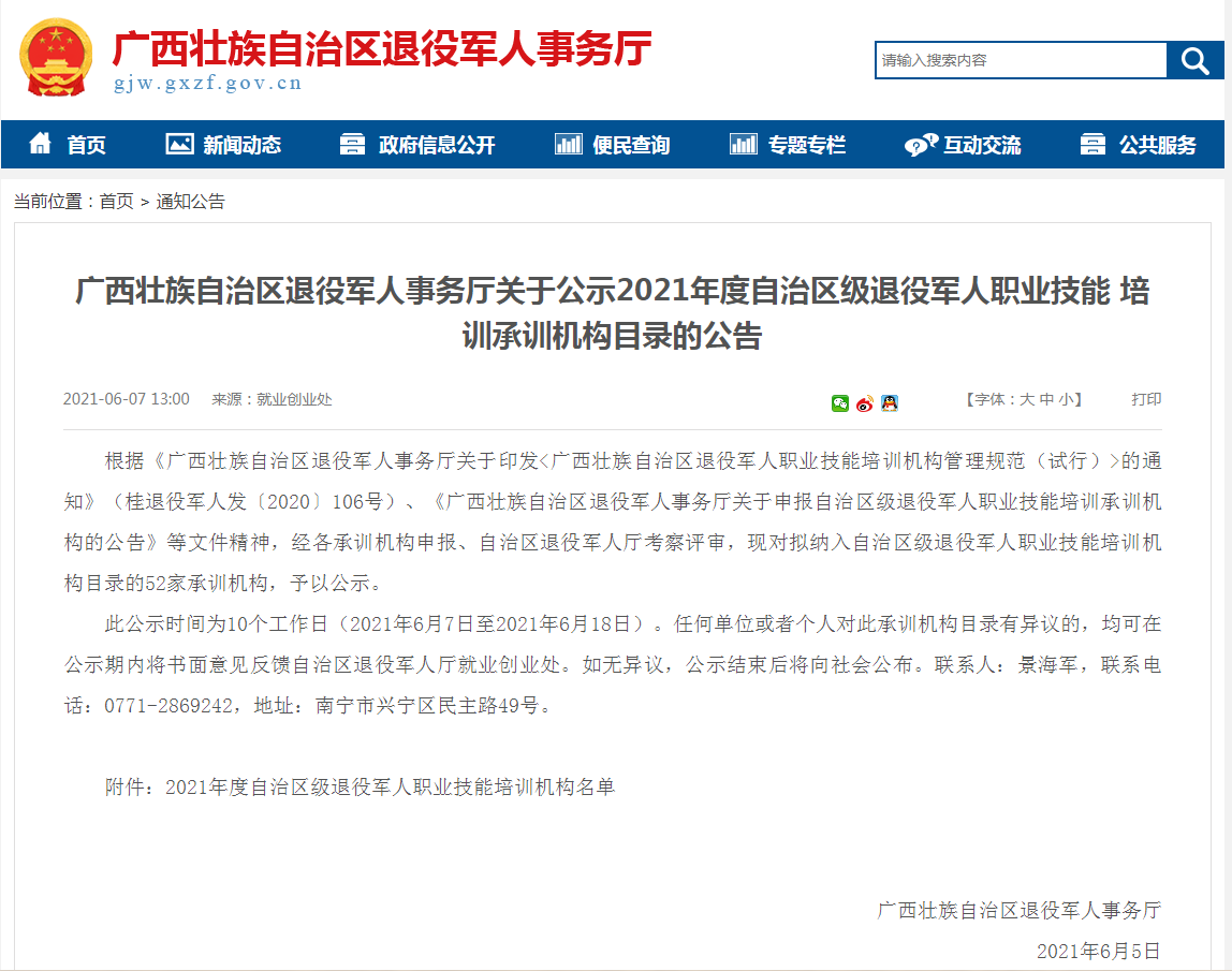 近日,根据《广西壮族自治区退役军人事务厅关于印发<广西壮族自治区退役军人职业技能培训机构管理规范(...
