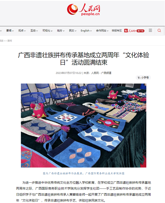 人民网、广西八桂职教网报道我校广西非遗壮族拼布传承基地成立两周年“文化体验日”活动。人民网链接:h...